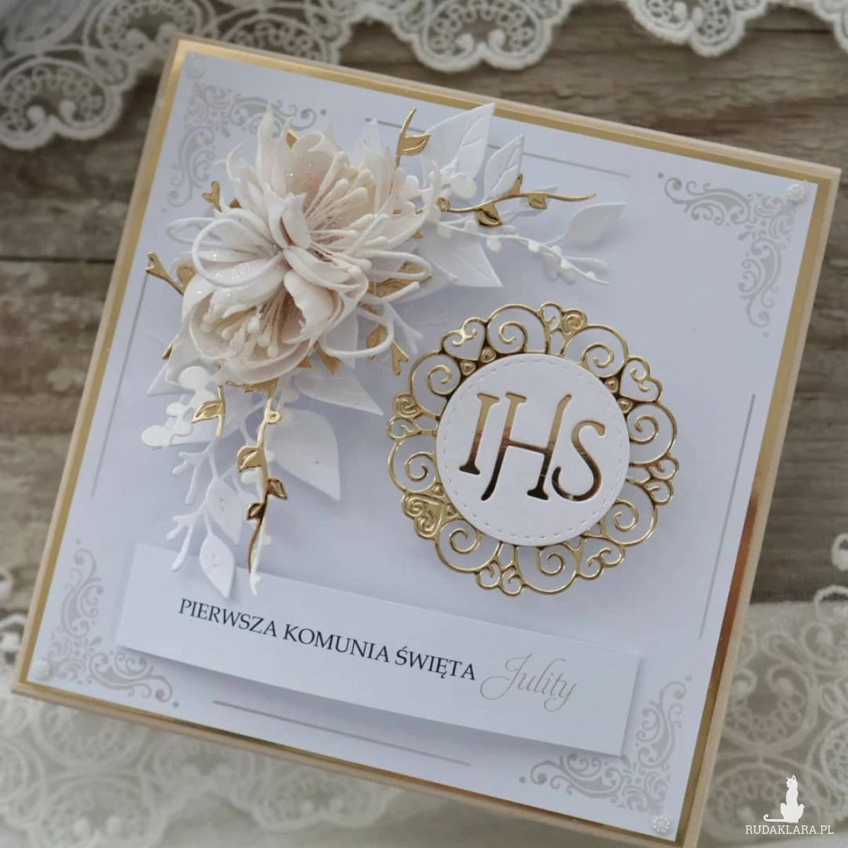 Elegancka kartka na Pierwszą Komunię Świętą w drewnianym pudełku to wyjątkowy, personalizowany prezent komunijny dla dziewczynki lub chłopca. Subtelna biało-złota kolorystyka oraz symbol IHS podkreślają uroczysty charakter tego dnia.