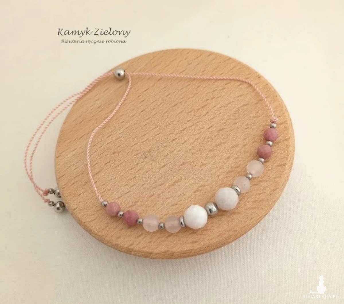 Bransoletka ma regulowaną długość, dzięki zastosowaniu specjalnego stopera w kształcie kuleczki, wykonanego ze stali chirurgicznej. Końce sznureczka wykończono malutkimi kuleczkami ze stali i naturalnych kamieni.
