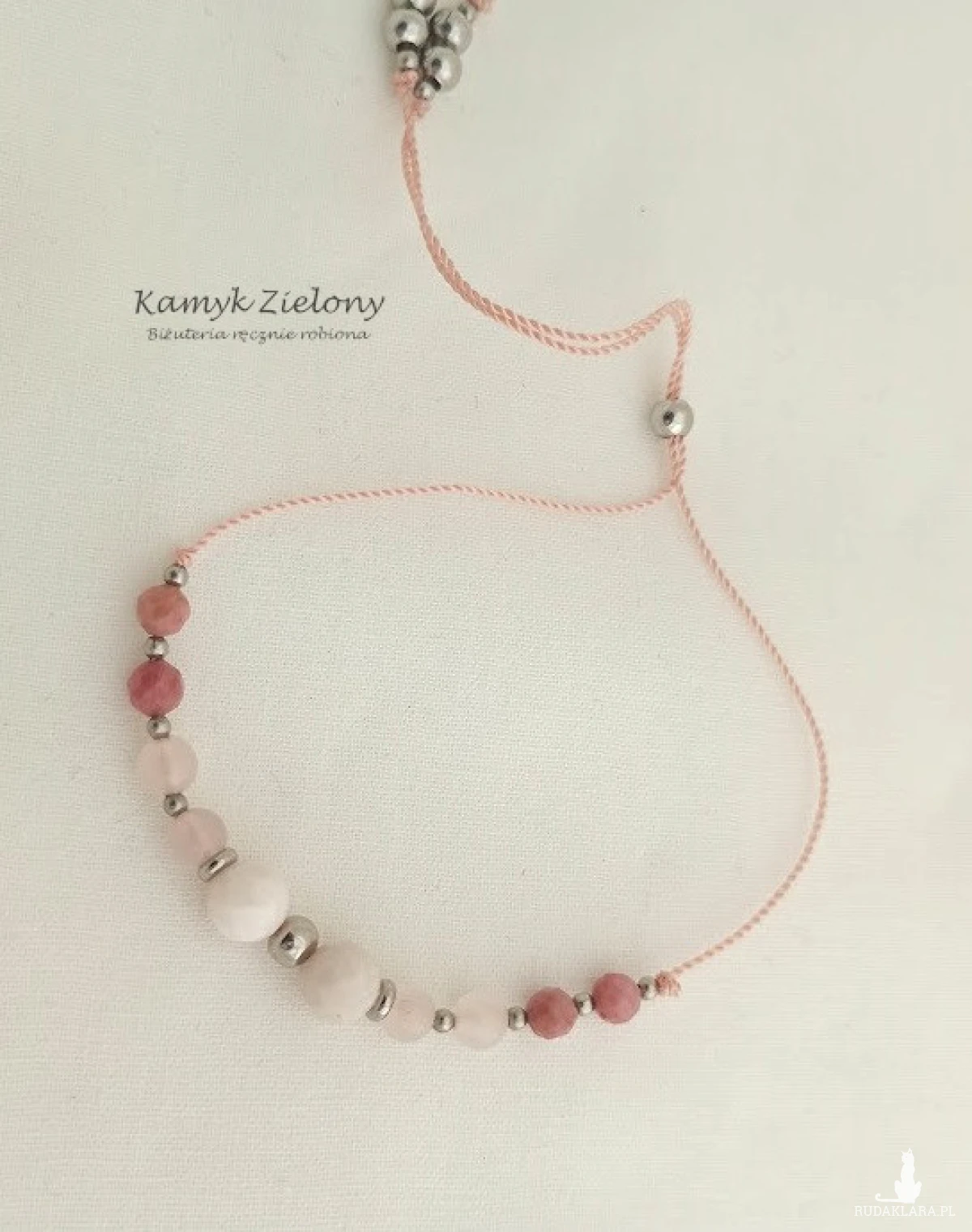 Do wykonania bransoletki użyto jedwabnego, skręcanego sznureczka o średnicy 0,7 mm, który charakteryzuje się niezwykłą wytrzymałością, a jednocześnie jest bardzo delikatny. Sznureczek nie strzępi się, ani nie rozciąga w czasie użytkowania biżuterii.