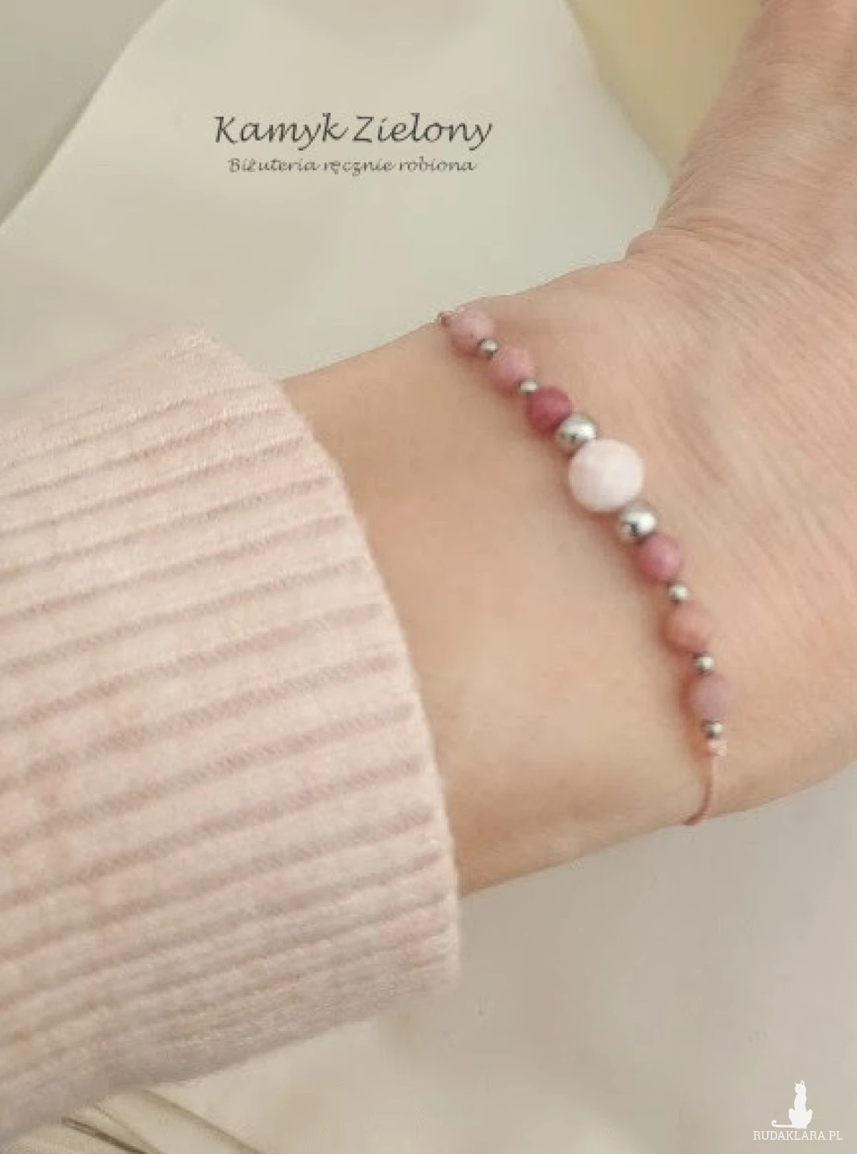 Minimalistyczna bransoletka z kamieni naturalnych - większej kulki opalu peruwiańskiego w jasnoróżowym odcieniu, 4-milimetrowych kuleczek różowego rodonitu oraz elementów ze stali chirurgicznej.