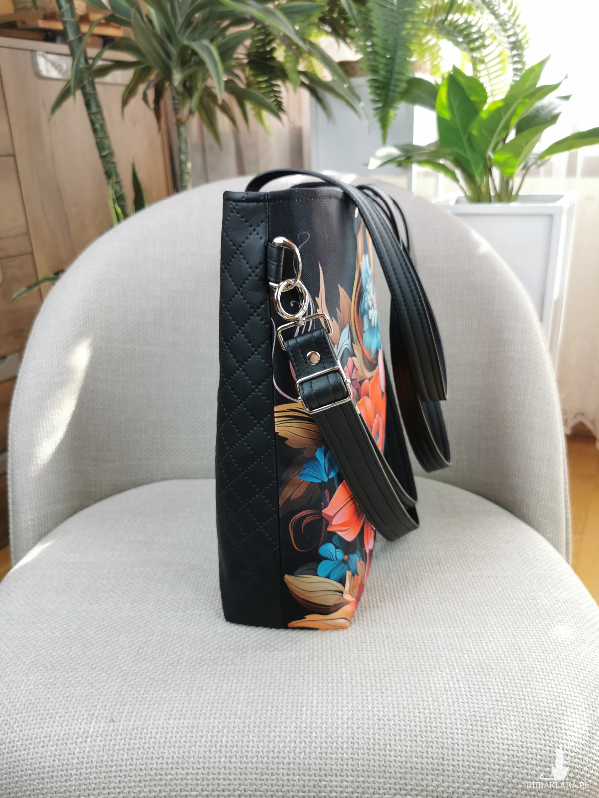 Wykonana z tkaniny o właściwościach wodoodpornych ( przód torebki ) , oraz czarnej pikowanej skóry ekologicznej ( tył torebki ) .