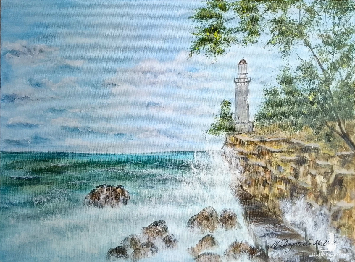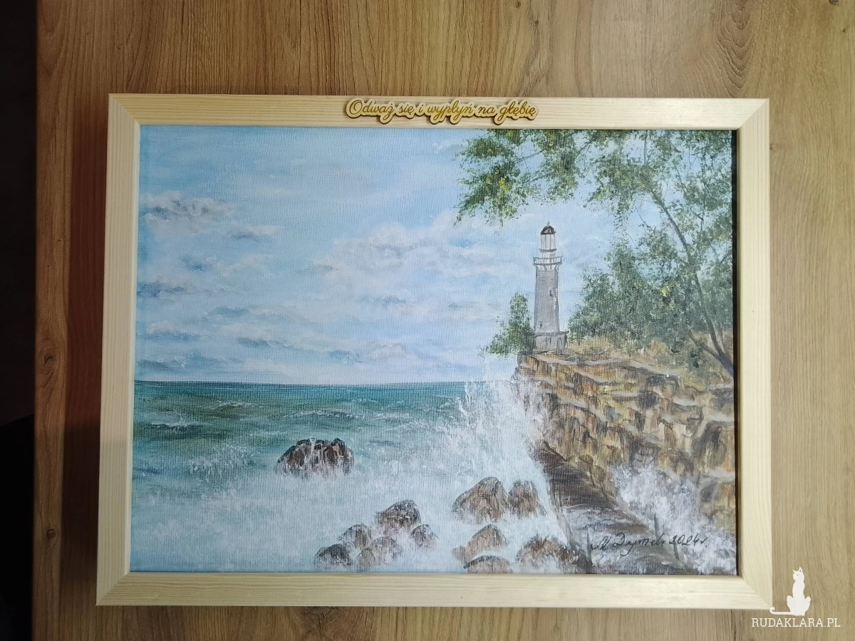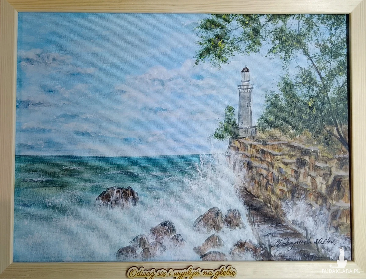 - Tematyka: Pejzaż morski, latarnia morska na klifie