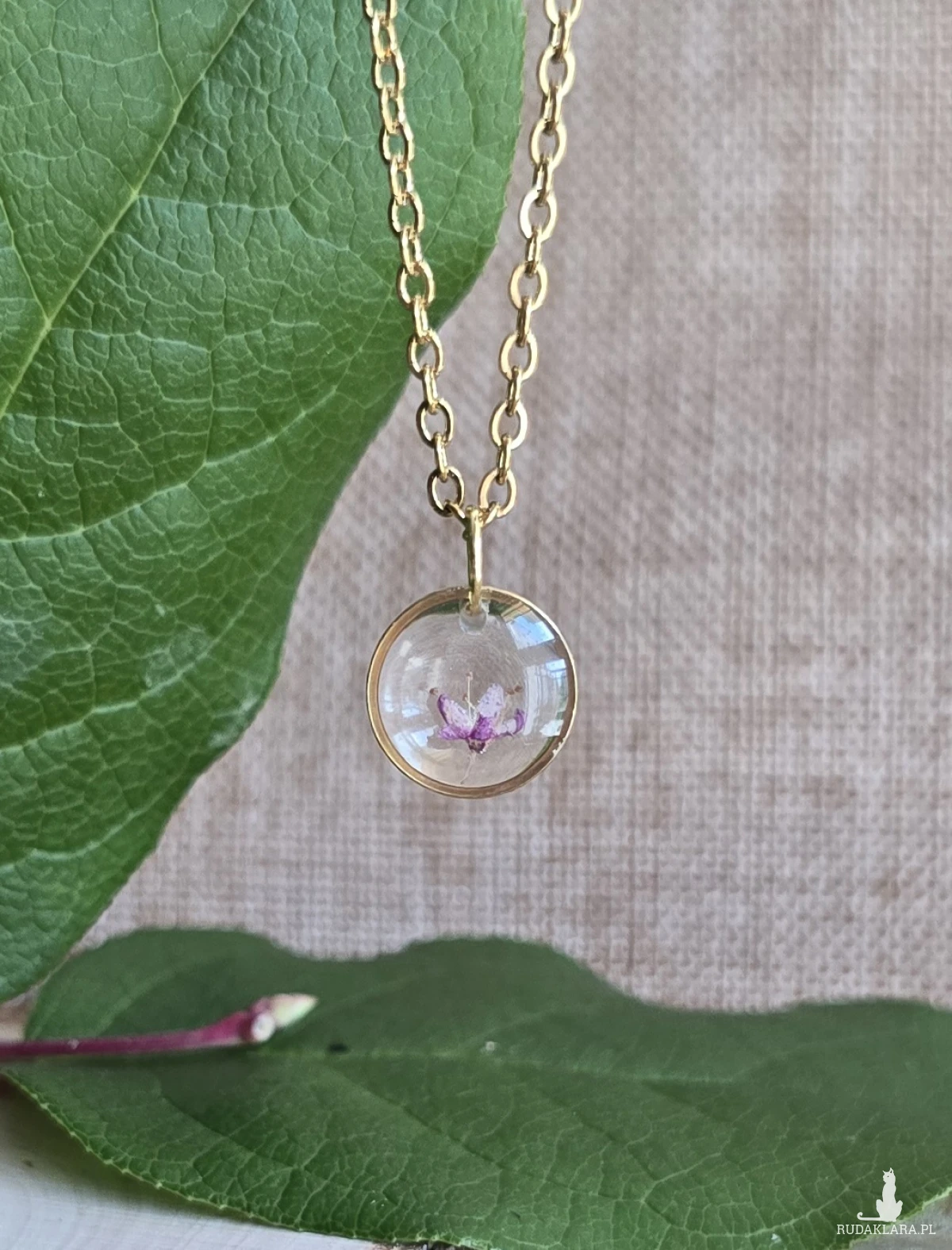 Oferuję Państwu unikalną biżuterię. Zawieszka jest wykonana z suszonych kwiatów i żywicy epoksydowej. Biżuteria jest wspaniałym i oryginalnym prezentem na lata.