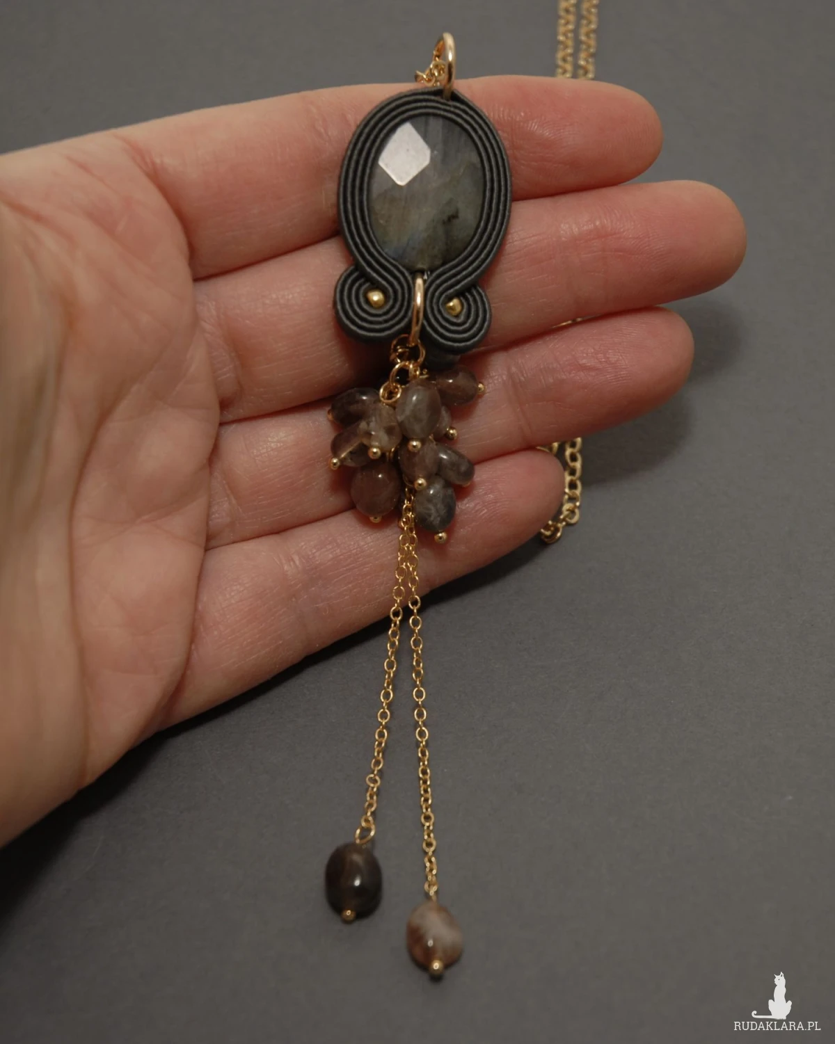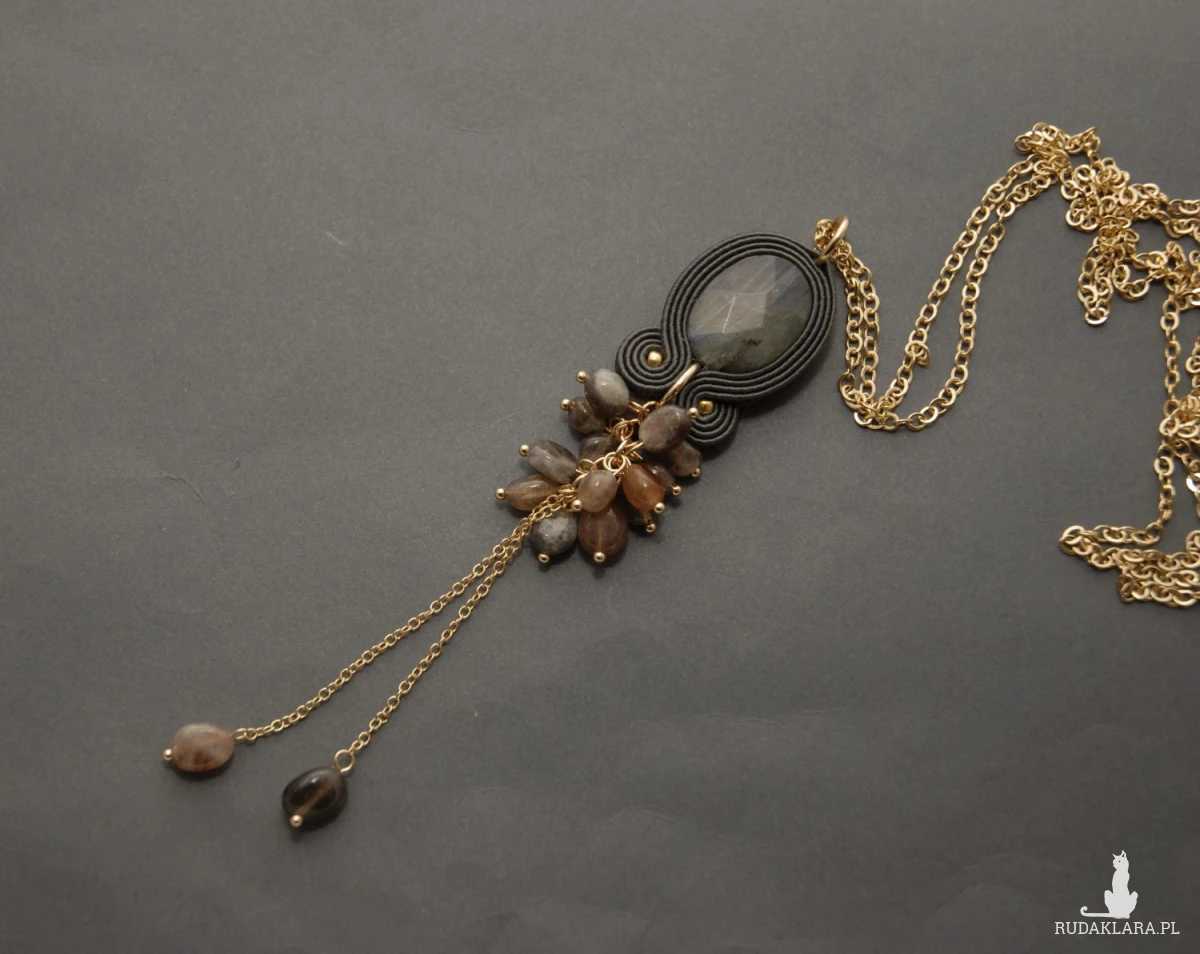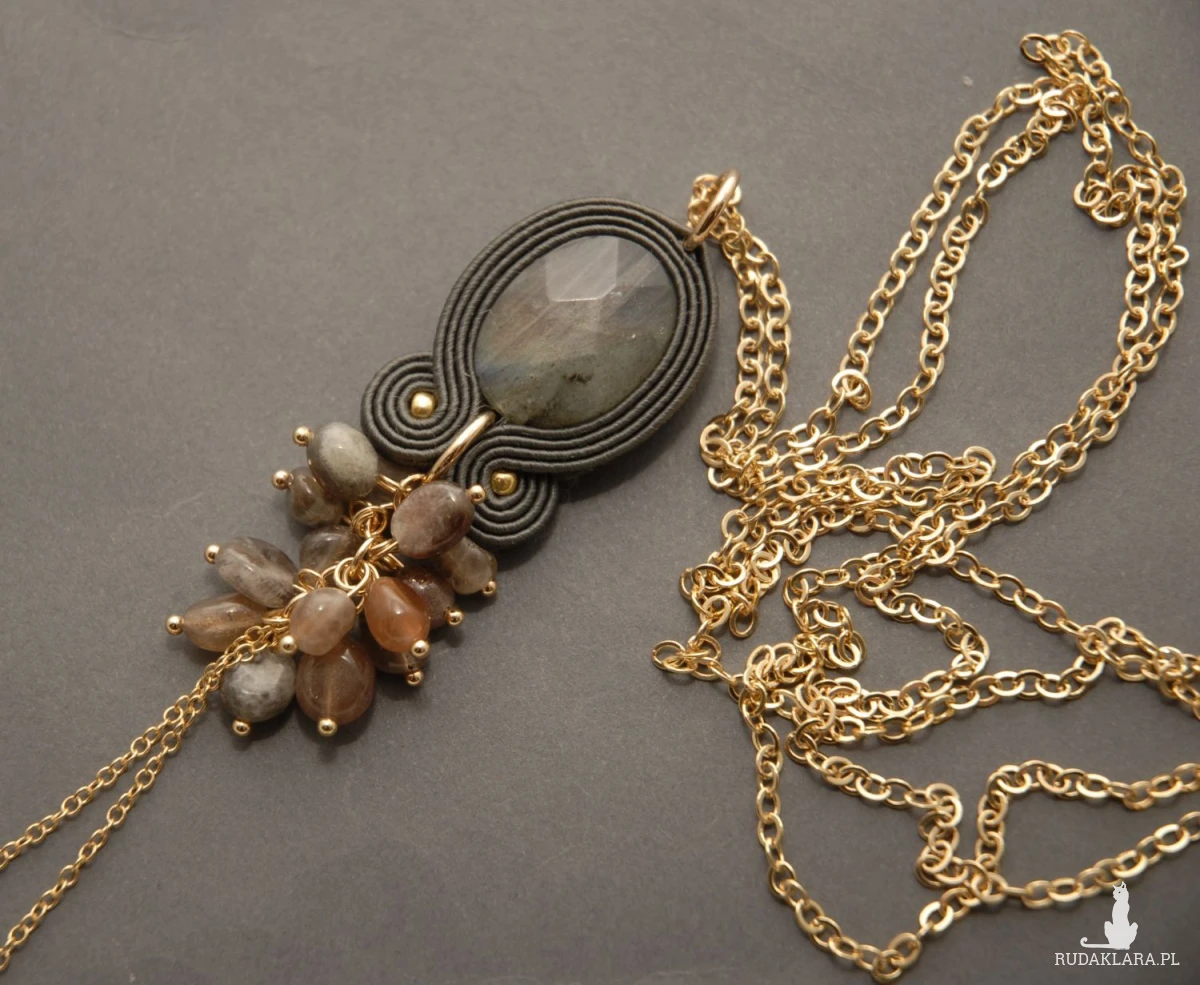 Oferuję wisiorek sutasz ozdobiony fasetowanym dużym labradorytem i agatami zamontowanymi na łańcuszkach