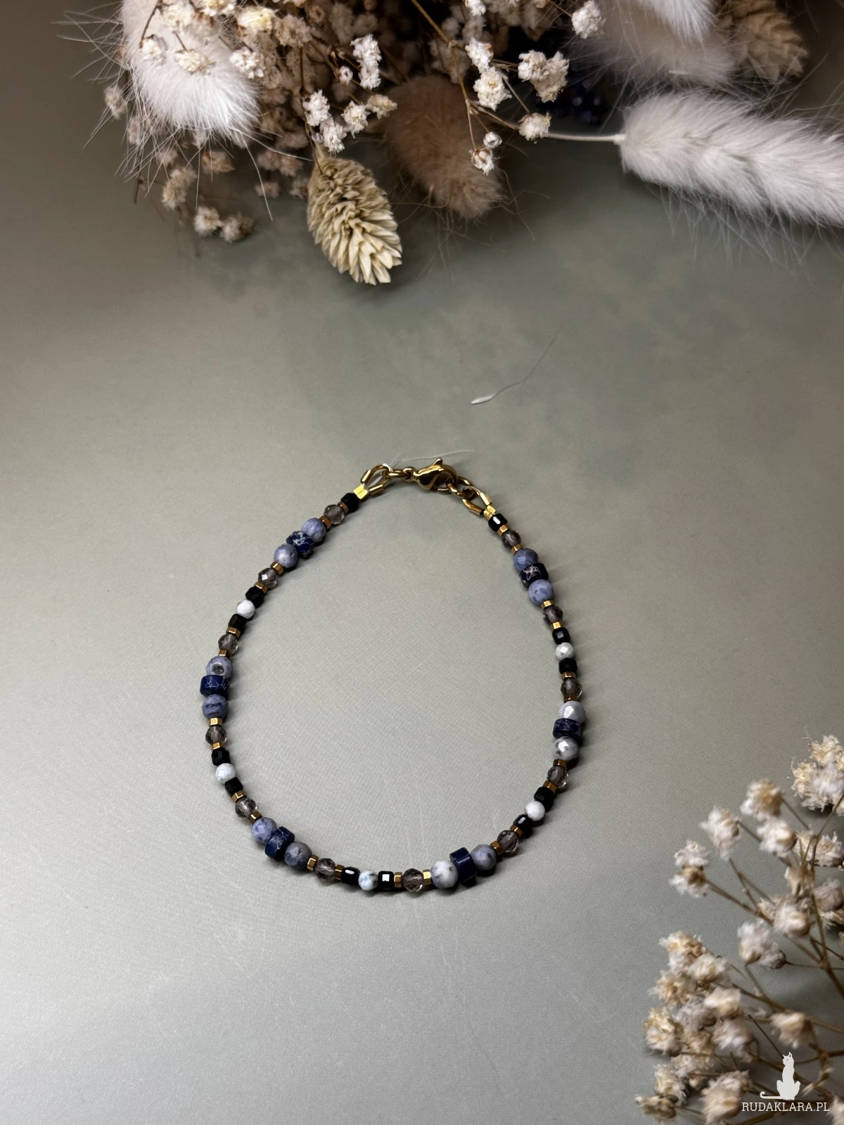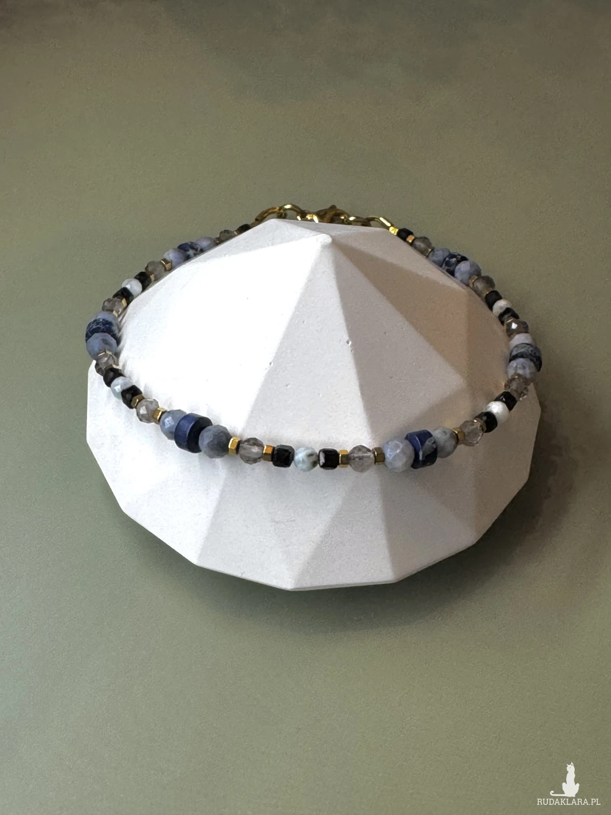 Delikatna bransoletka z drobnych 3-4 milimetrowych kamieni larimaru, niebieskiego korala, jaspisu, turmalinu czarnego oraz kwarcu dymnego. Całość wykończyłam hematytem i zapięciem ze stali chirurgicznej w złotym kolorze.