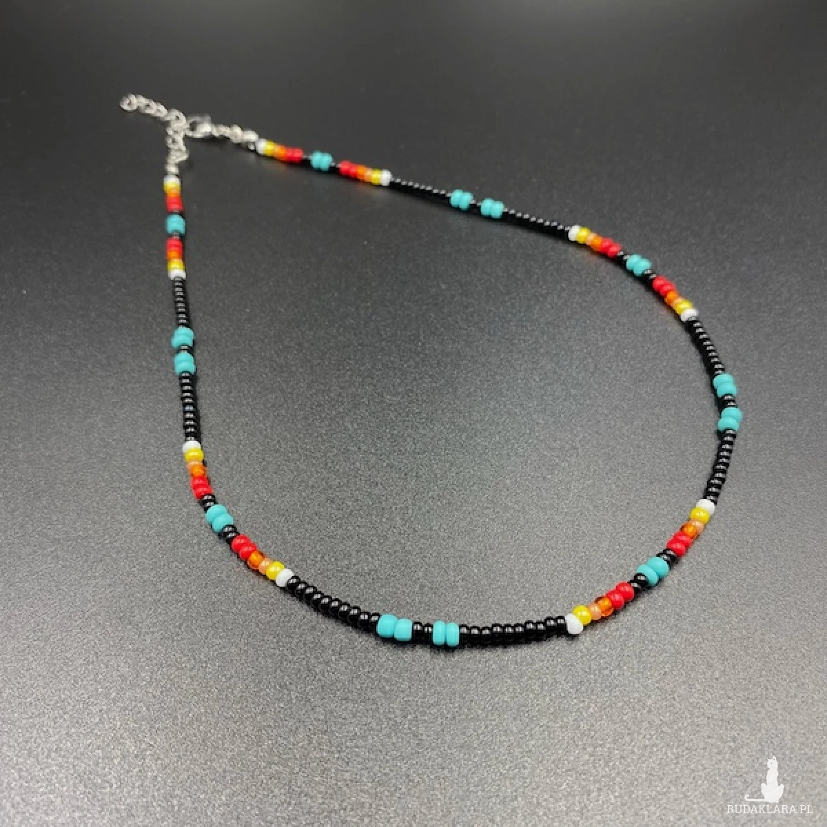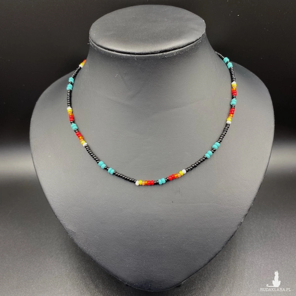 Krótki naszyjnik został wykonany ręcznie ze szklanych koralików w kolorze czerwonym, czarnym i turkusowym, pomarańczowym, żółtym i białym.