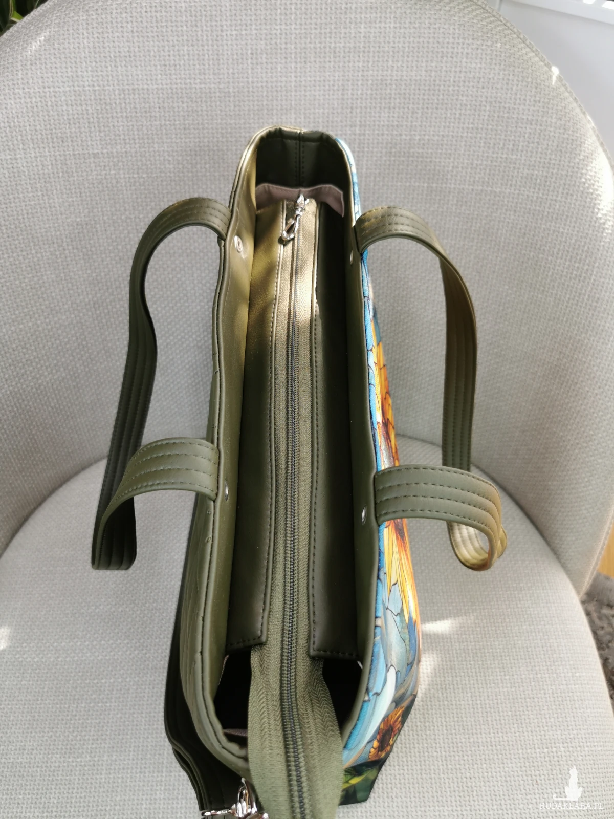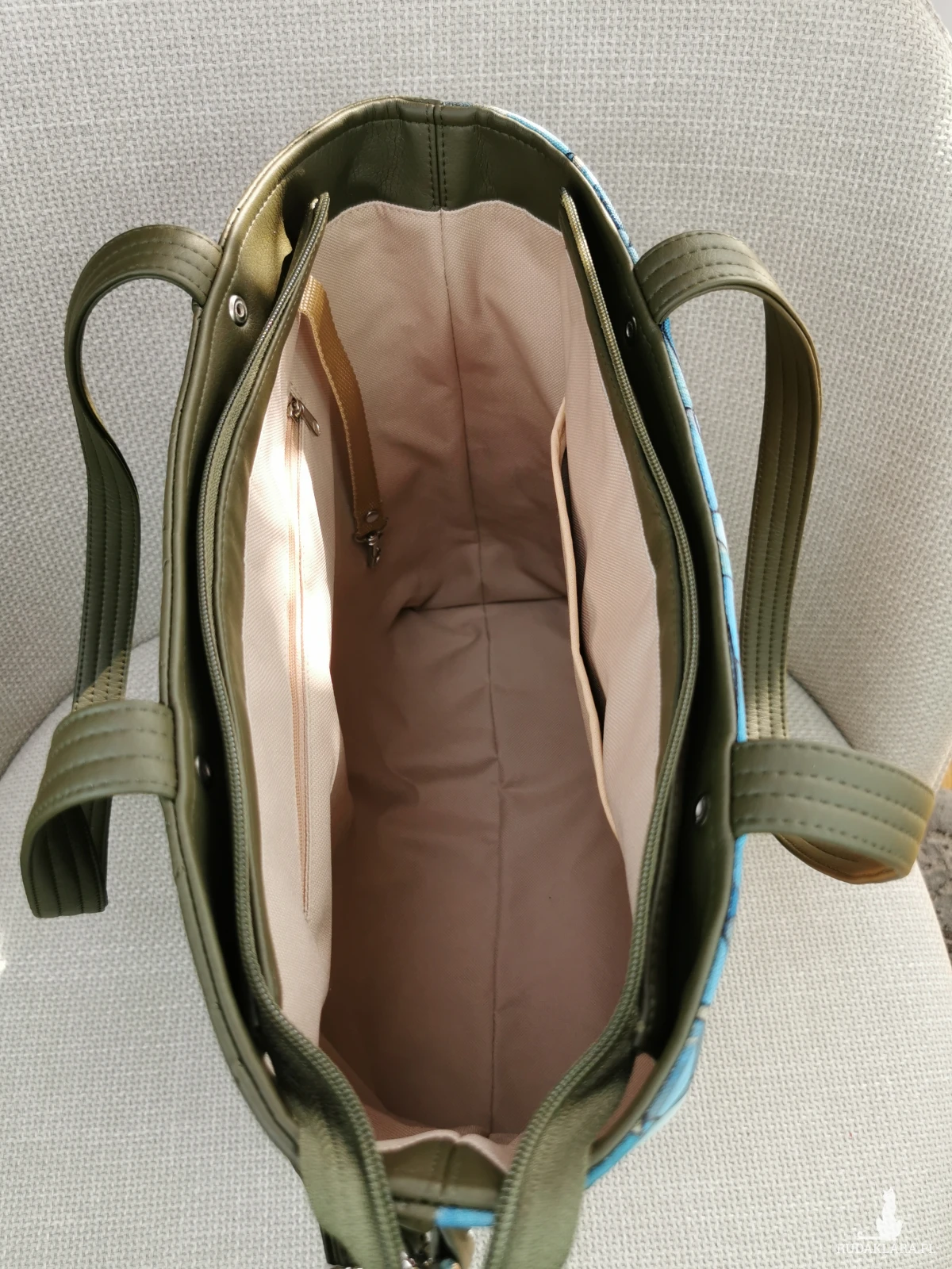Wykonana z tkaniny o właściwościach wodoodpornych ( przód torebki ) , oraz zielonej (kolor khaki) pikowanej i gładkiej skóry ekologicznej ( tył torebki, uchwyty ) .