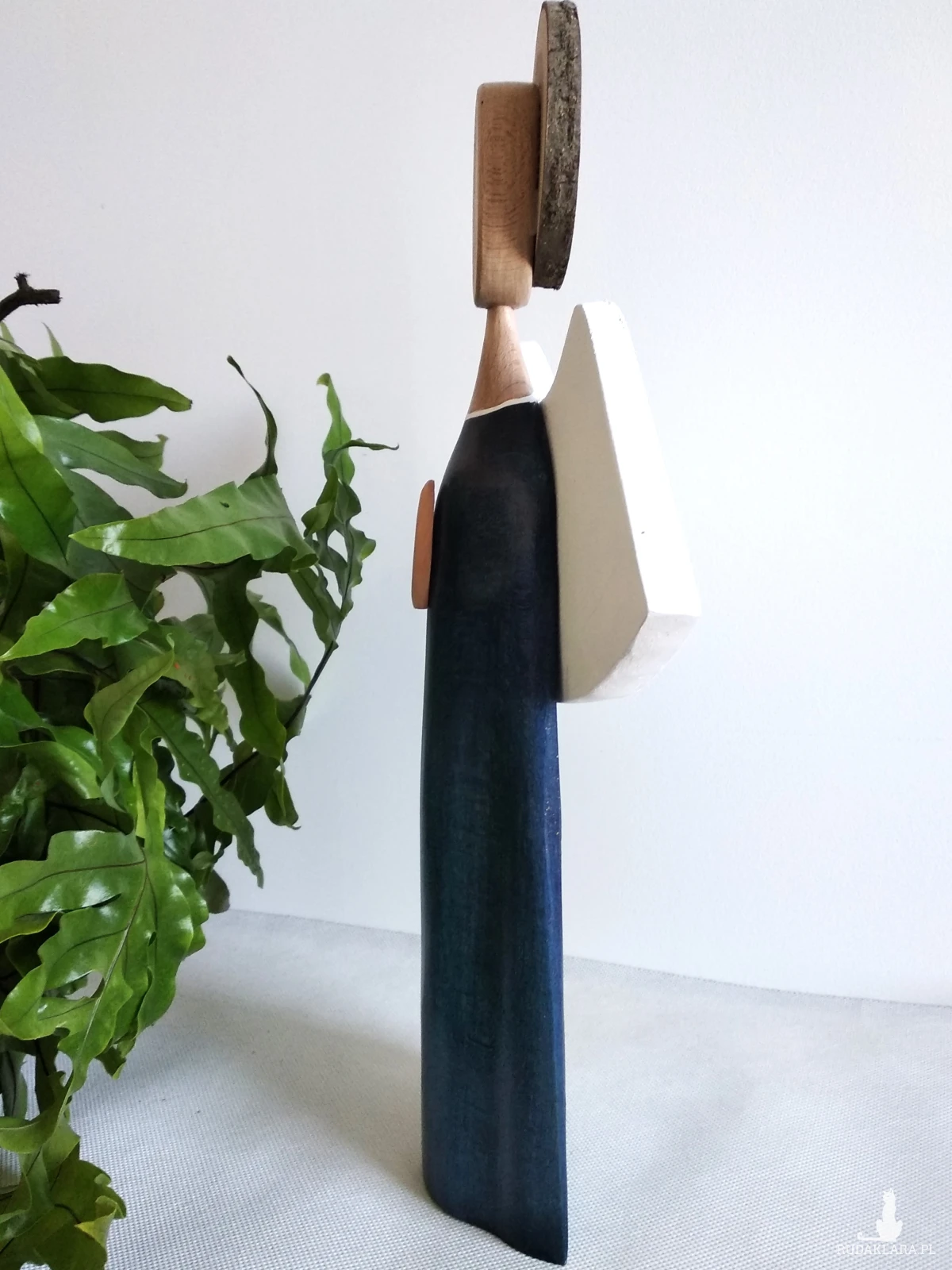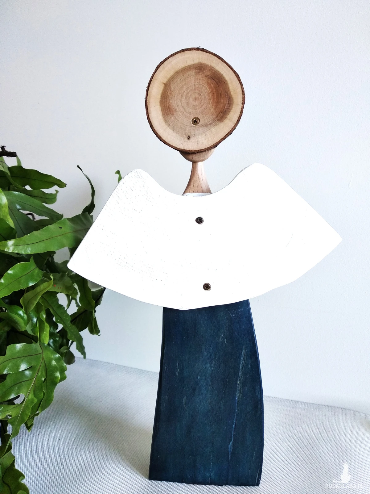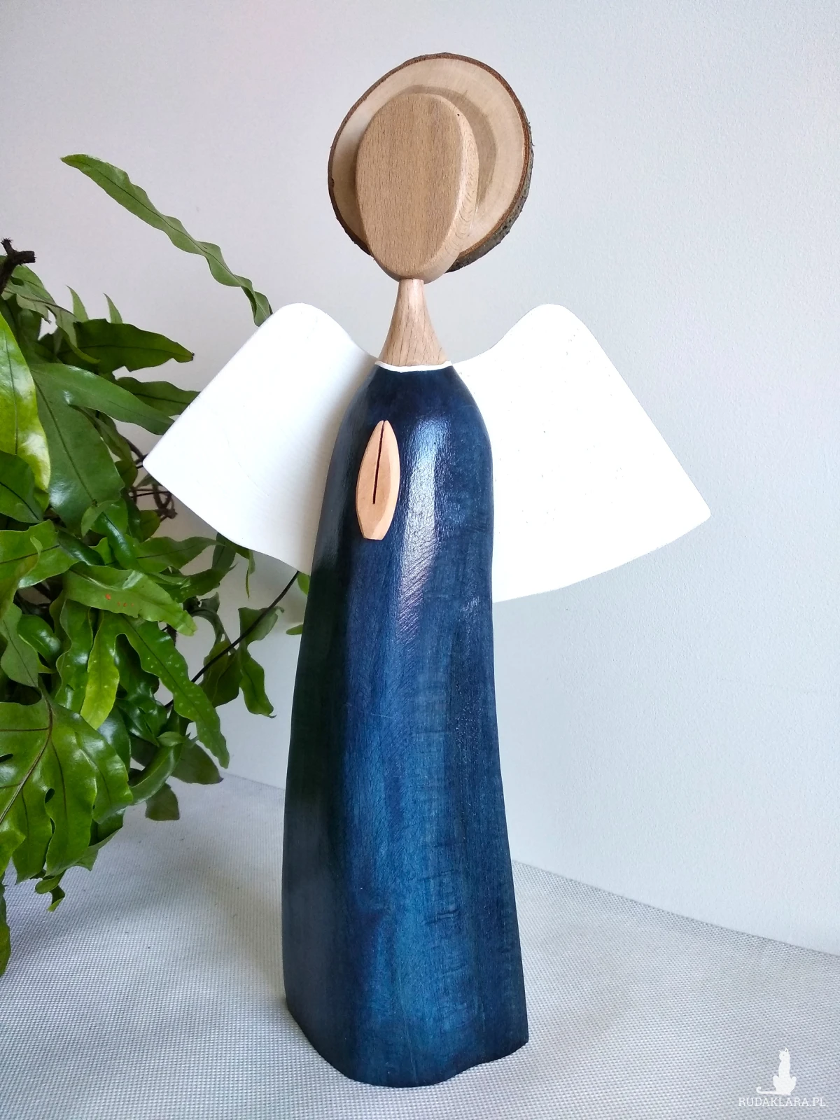 Autorski anioł wykonany ręcznie z różnego rodzaju naturalnego drewna, barwionego bejcą wodną, malowanego akrylową farbą lub pozostawionego w swojej naturalnej barwie. Każdy egzemplarz tworzę samodzielnie – nie jest to produkt masowy.