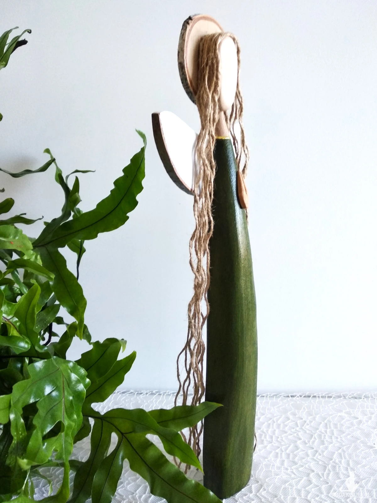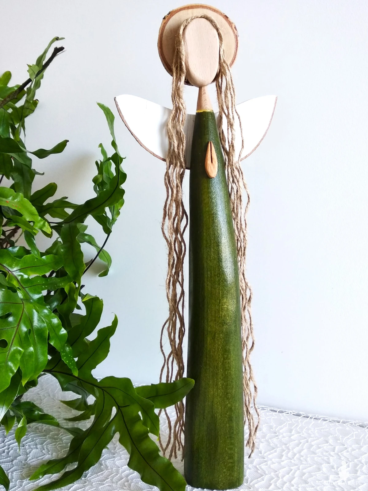 Autorski anioł wykonany ręcznie z rożnych gatunków naturalnego drewna,barwionego bejcą wodną, malowanego akrylową farbą lub pozostawionego w swojej naturalnej barwie.