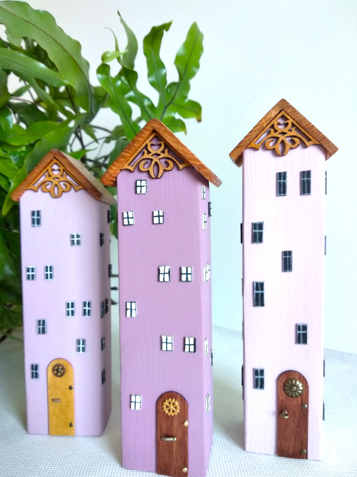 Te trzy ręcznie wykonane domki w delikatnych odcieniach fioletu to dekoracja, która wnosi do wnętrza subtelność, spokój i odrobinę bajkowej magii. Ich smukłe formy i pastelowe kolory przyciągają wzrok, a każdy szczegół, od okienek po zdobione drzwi i misternie ornamenty tworzy opowieść o wyjątkowym miejscu, gdzie czas płynie łagodniej.Domki wykonane są z drewna sosnowego , materiału, który łączy w sobie trwałość i naturalne piękno. Idealnie sprawdzą się jako prezent, dekoracja półki, parapetu lub element większej kolekcji.