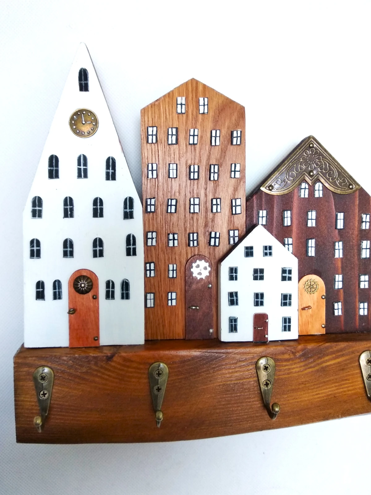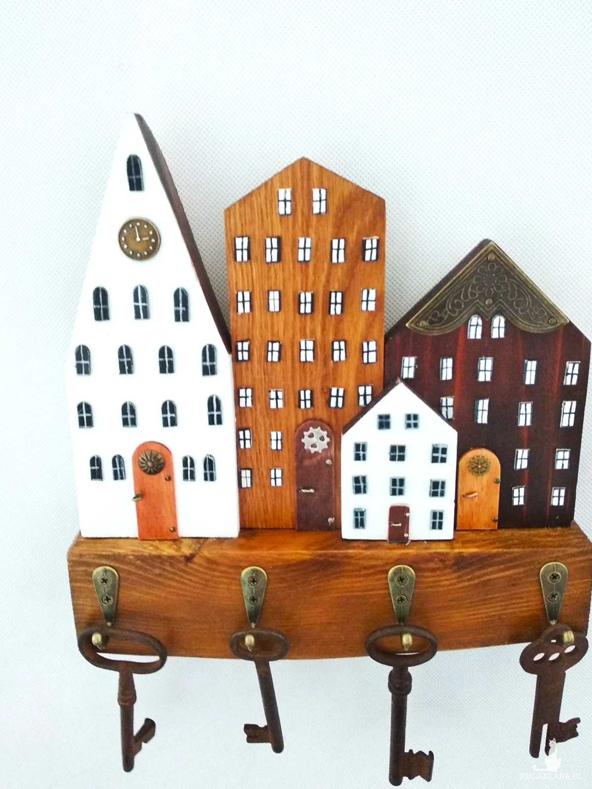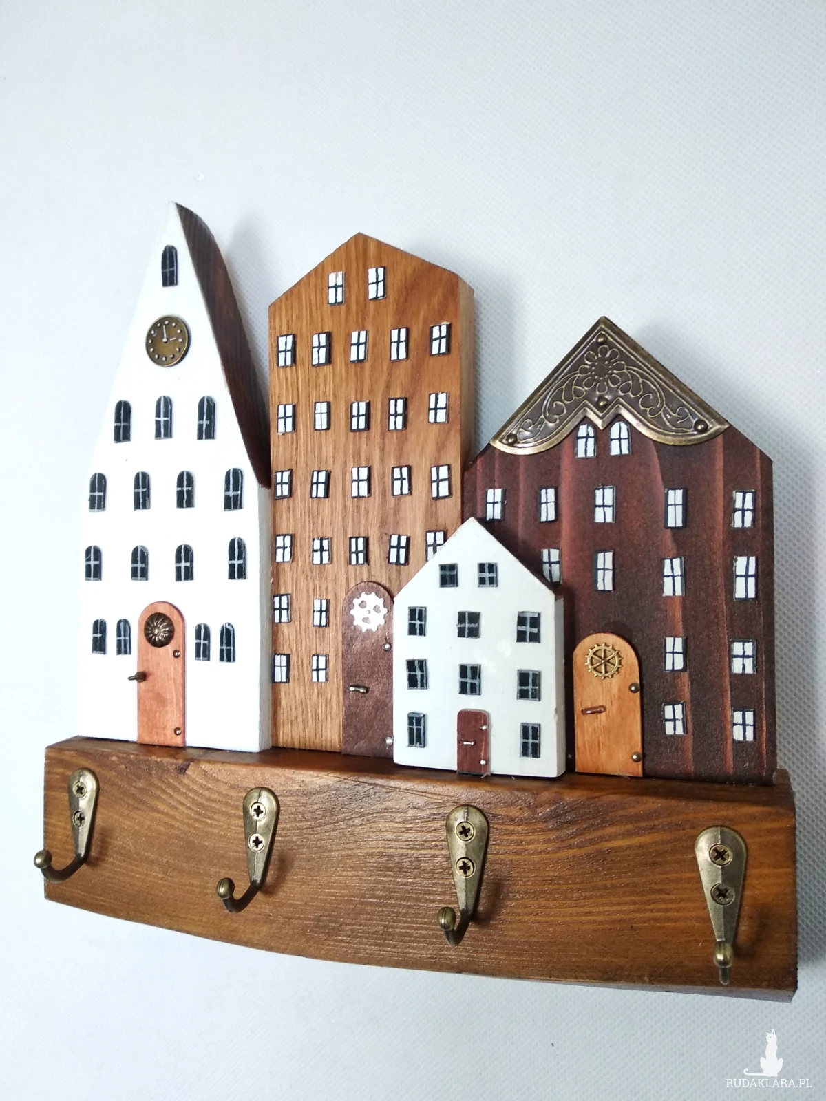 Subtelny i praktyczny element wyposażenia, który pomaga utrzymać porządek w domu. Wyposażony w cztery haczyki, sprawdzi się do przechowywania kluczy, biżuterii czy drobnych akcesoriów. Dzięki temu codzienne przedmioty zawsze będą pod ręką, a Ty zyskasz spokój i porządek w przestrzeni. Drewniana forma, stylizowana na rząd domków, wnosi do wnętrza przytulny klimat, a jednocześnie pozostaje trwała i funkcjonalna. To rozwiązanie, które łączy praktyczność z charakterem rękodzieła, nadając wnętrzu niepowtarzalny akcent.