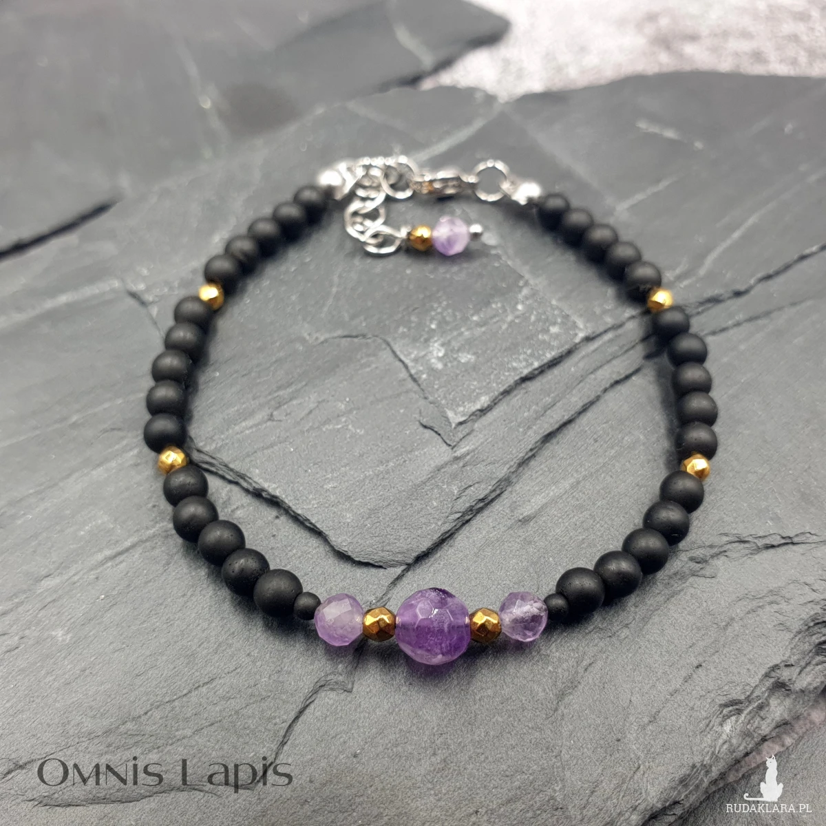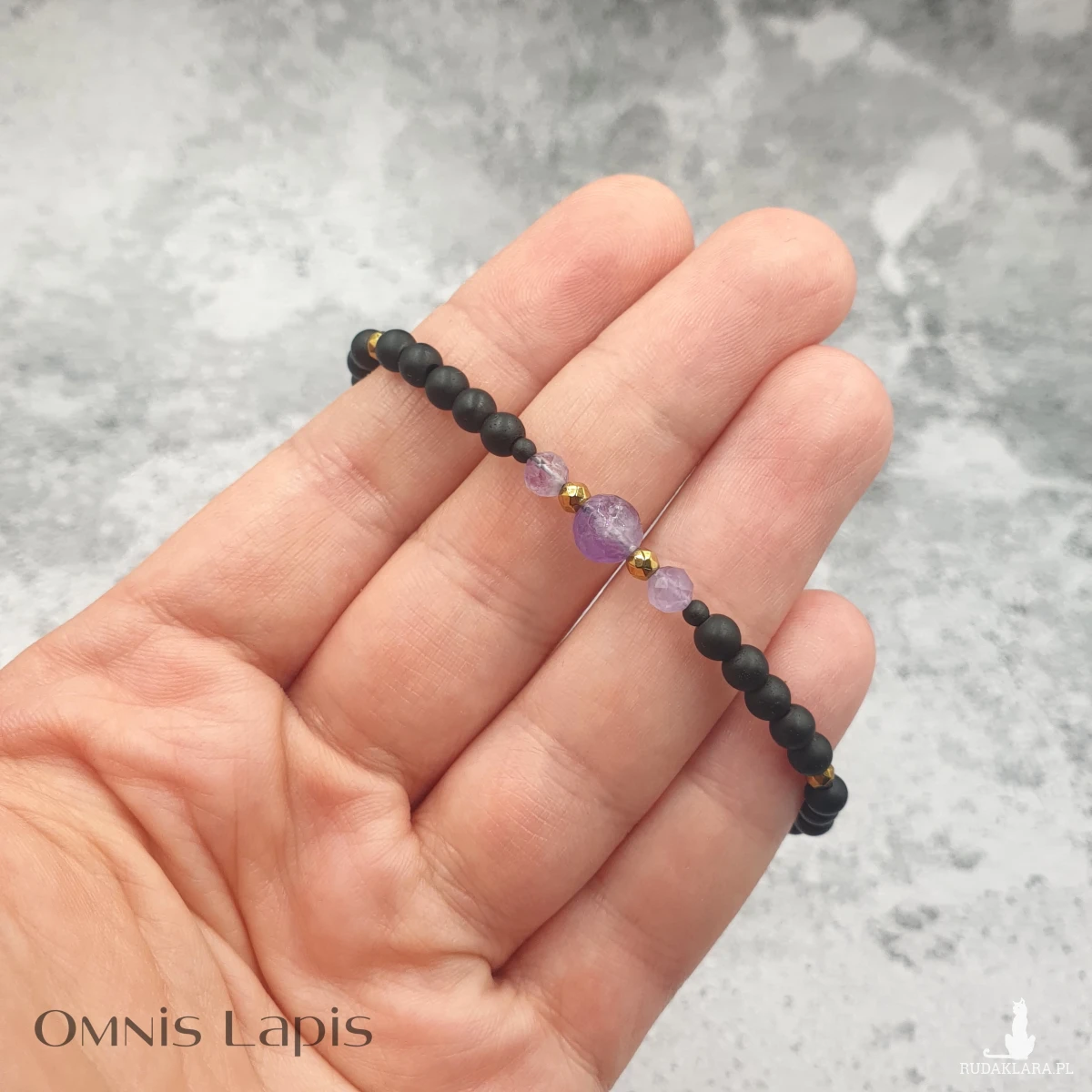 Bransoletka w wersji mini. Wykonana z kul czarnego, matowego hematytu. Centrum bransoletki stanowią kule ametystu, przedzielone kulami złotego hematytu.