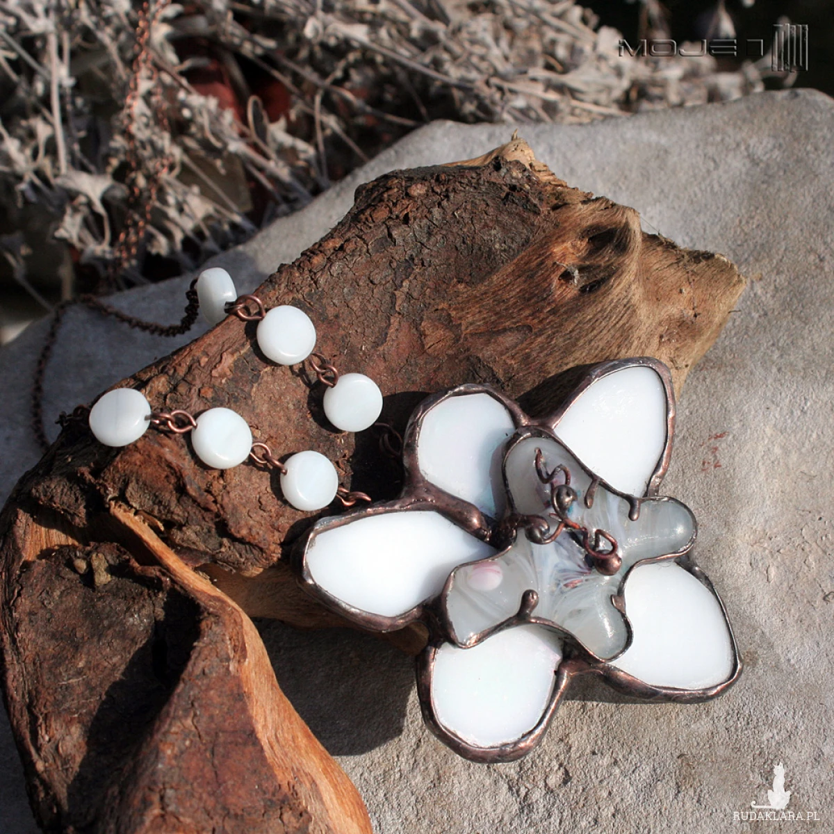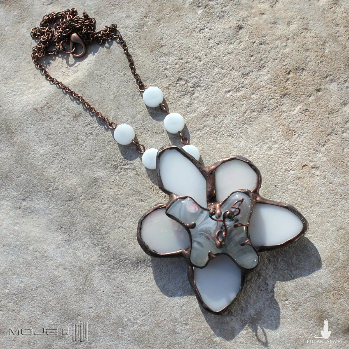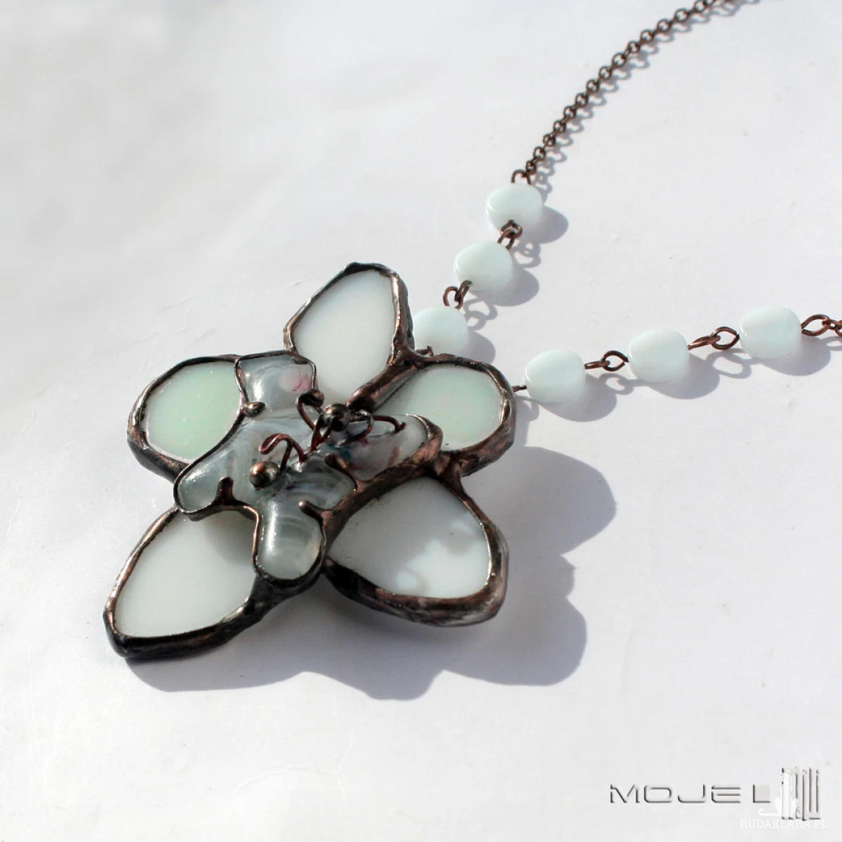 Zawieszony jest na łańcuszku w kolorze miedzianym i ozdobionym białymi szklanymi pastylkami.