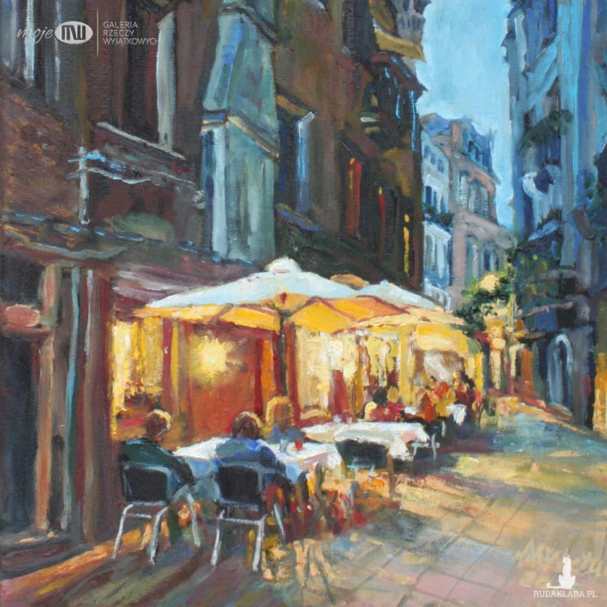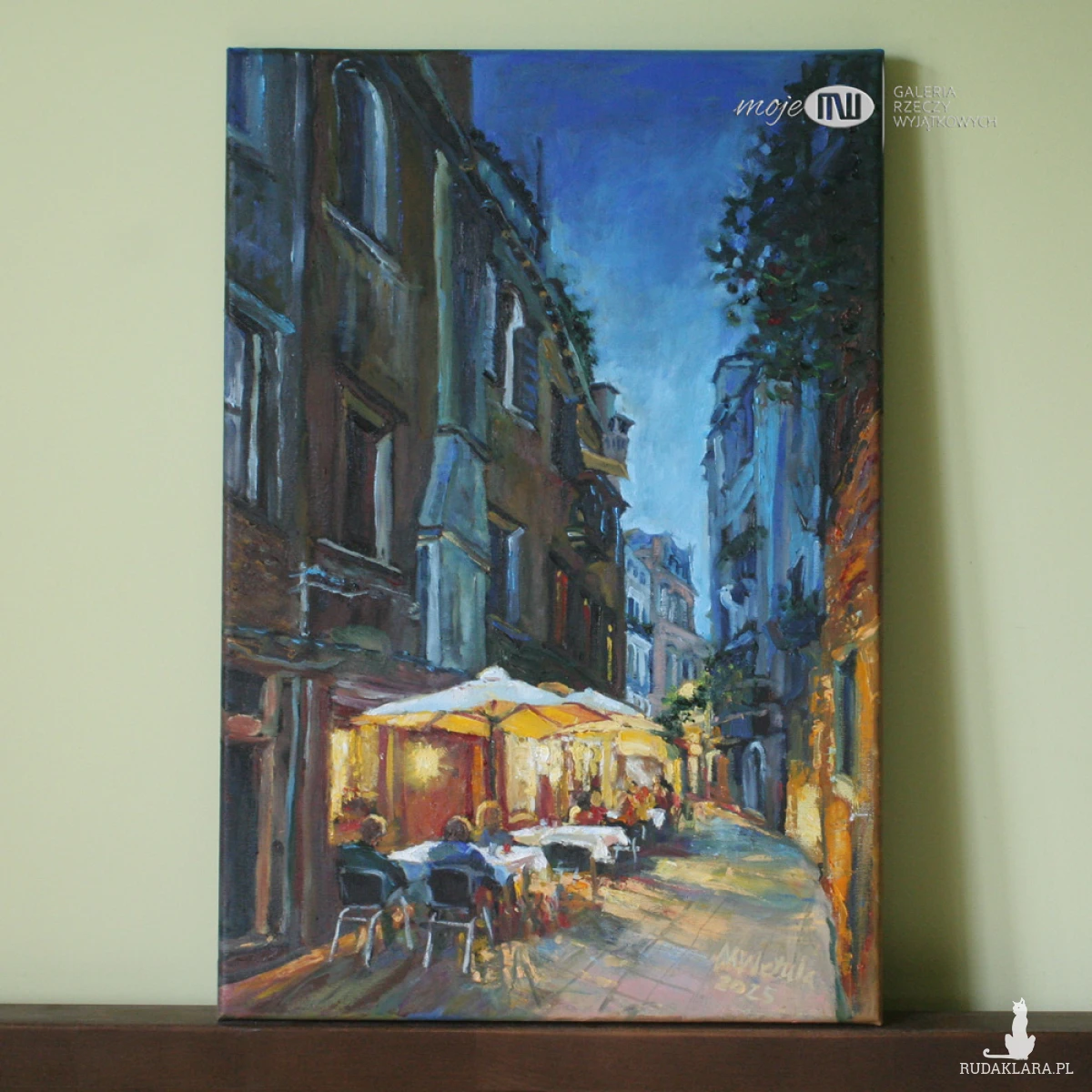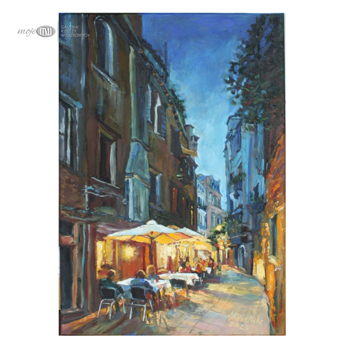 Obraz olejny malowany na płótnie, utrzymany w zawężonej palecie barw z wyraźnym kontrastem niebieskiego z żółcią i odcieniami pomarańczu. Będzie stanowił zdecydowany kolorystyczny i dekoracyjny akcent we wnętrzu.