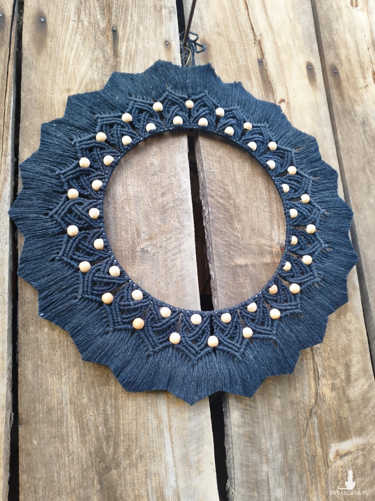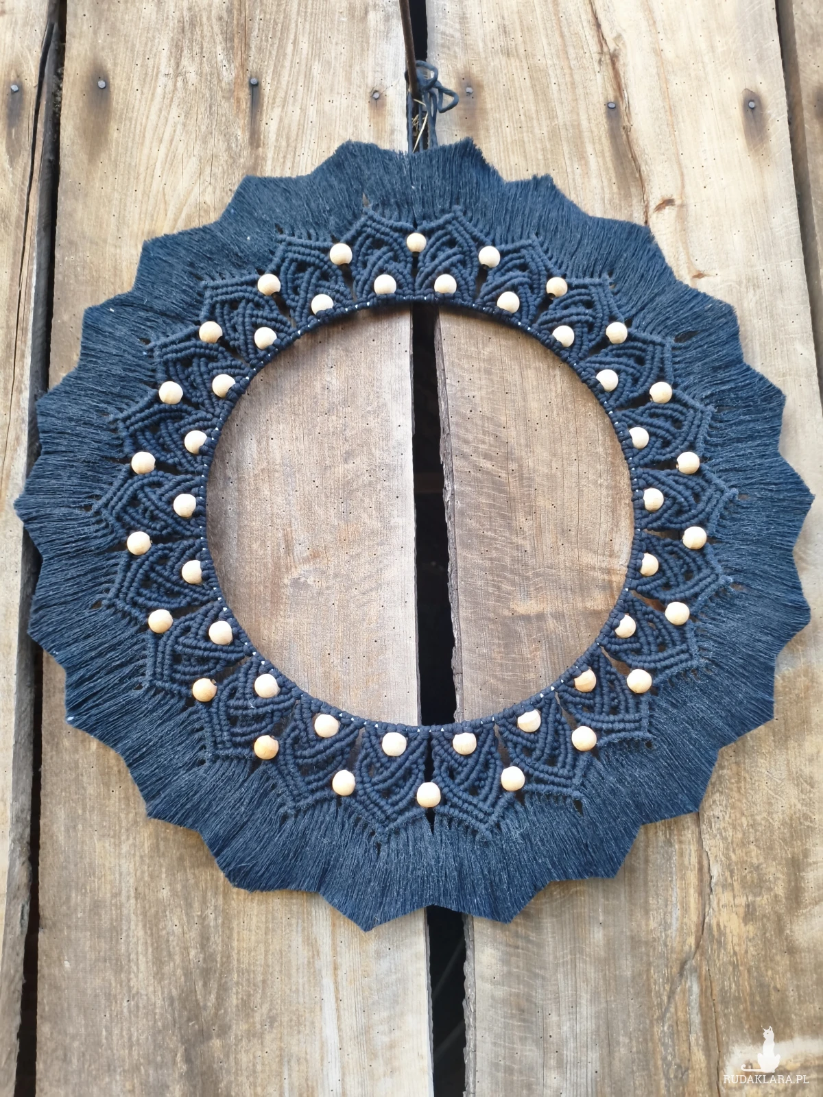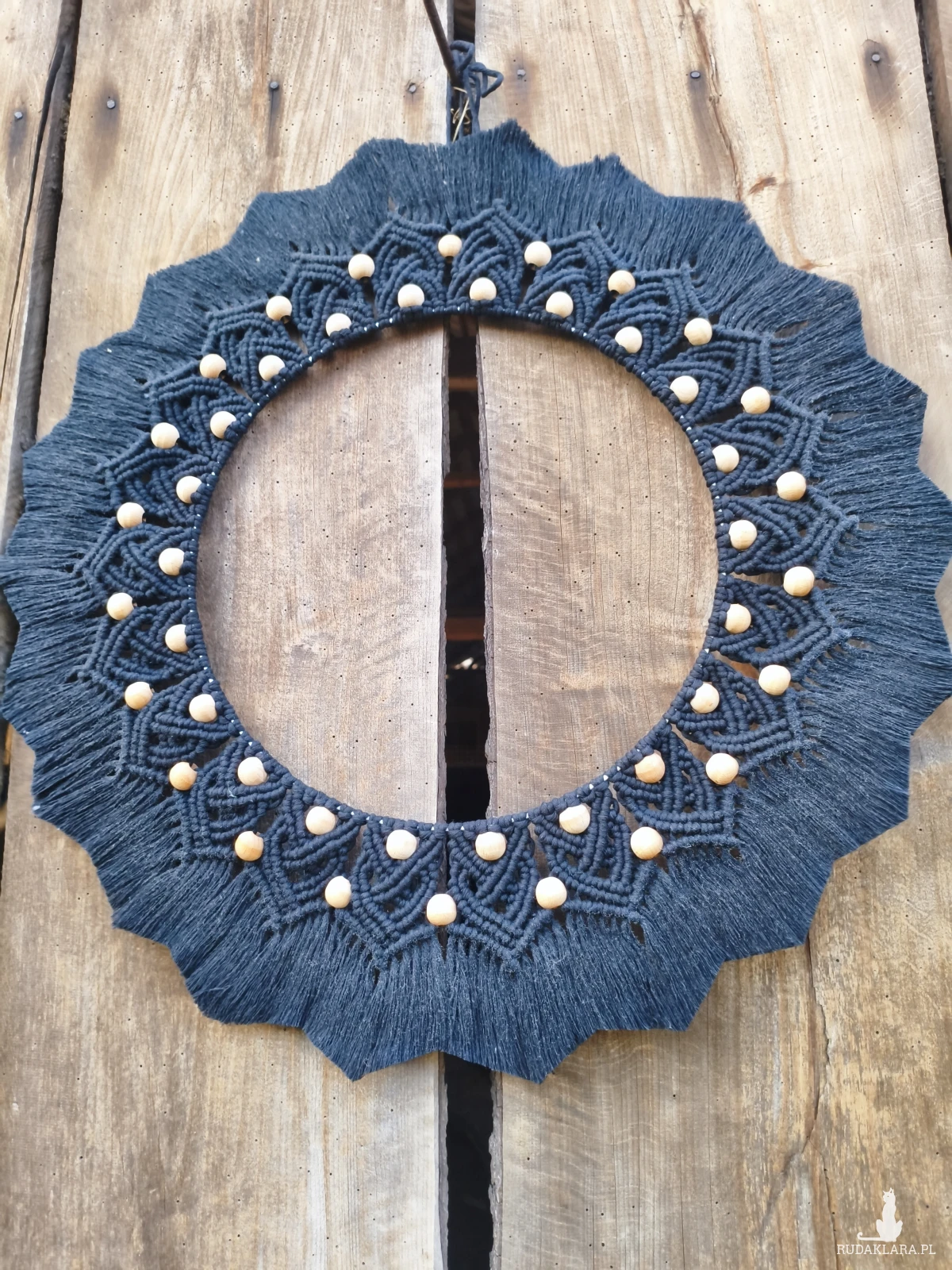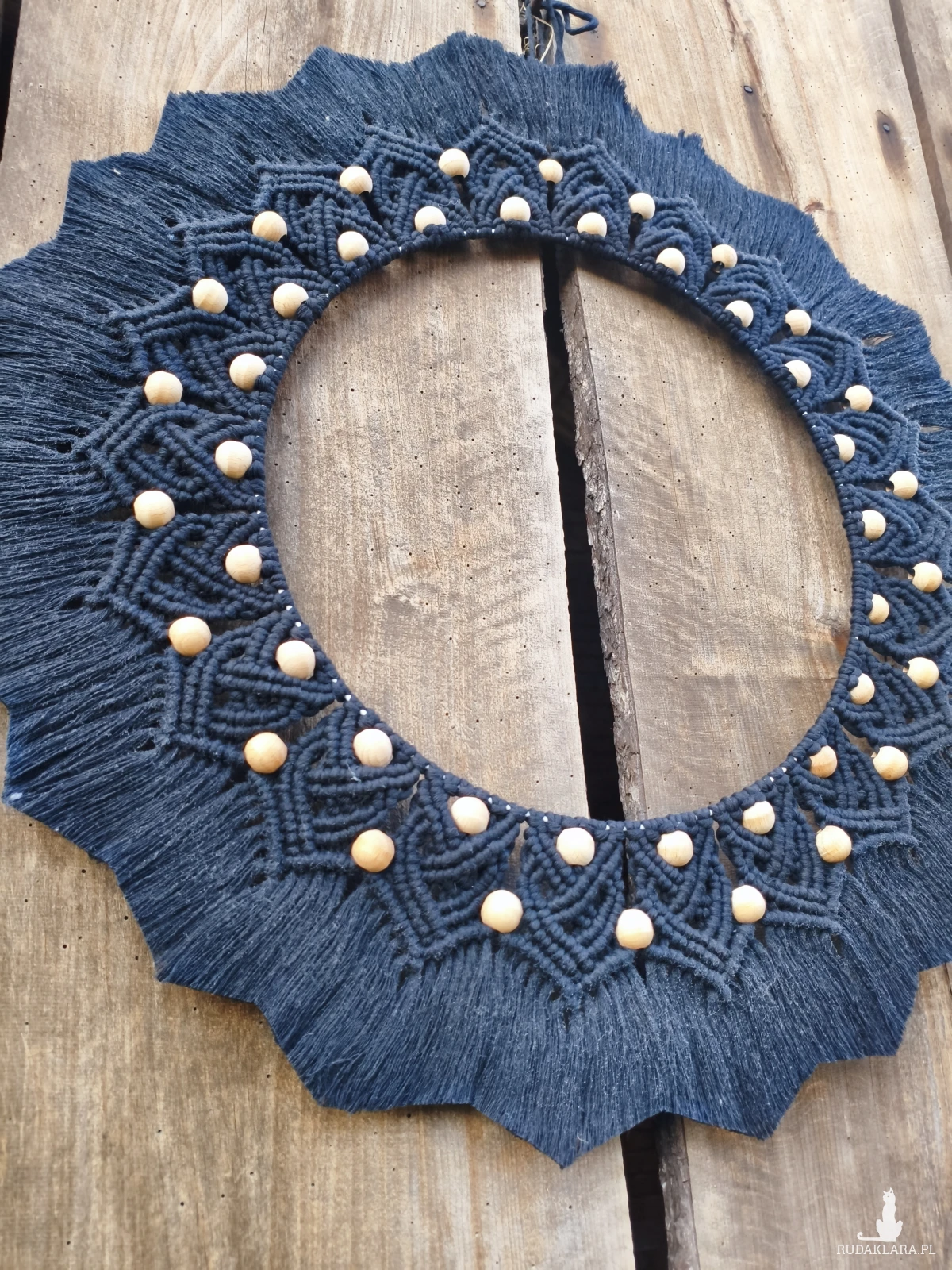 Ręcznie wypleciona mandala makramowa wykonana ze sznurka skręcanego o grubości 3 mm w kolorze czarnym, ozdobiona naturalnymi drewnianymi koralikami. Każdy splot powstawał ręcznie, dzięki czemu dekoracja ma wyjątkowy, niepowtarzalny charakter.