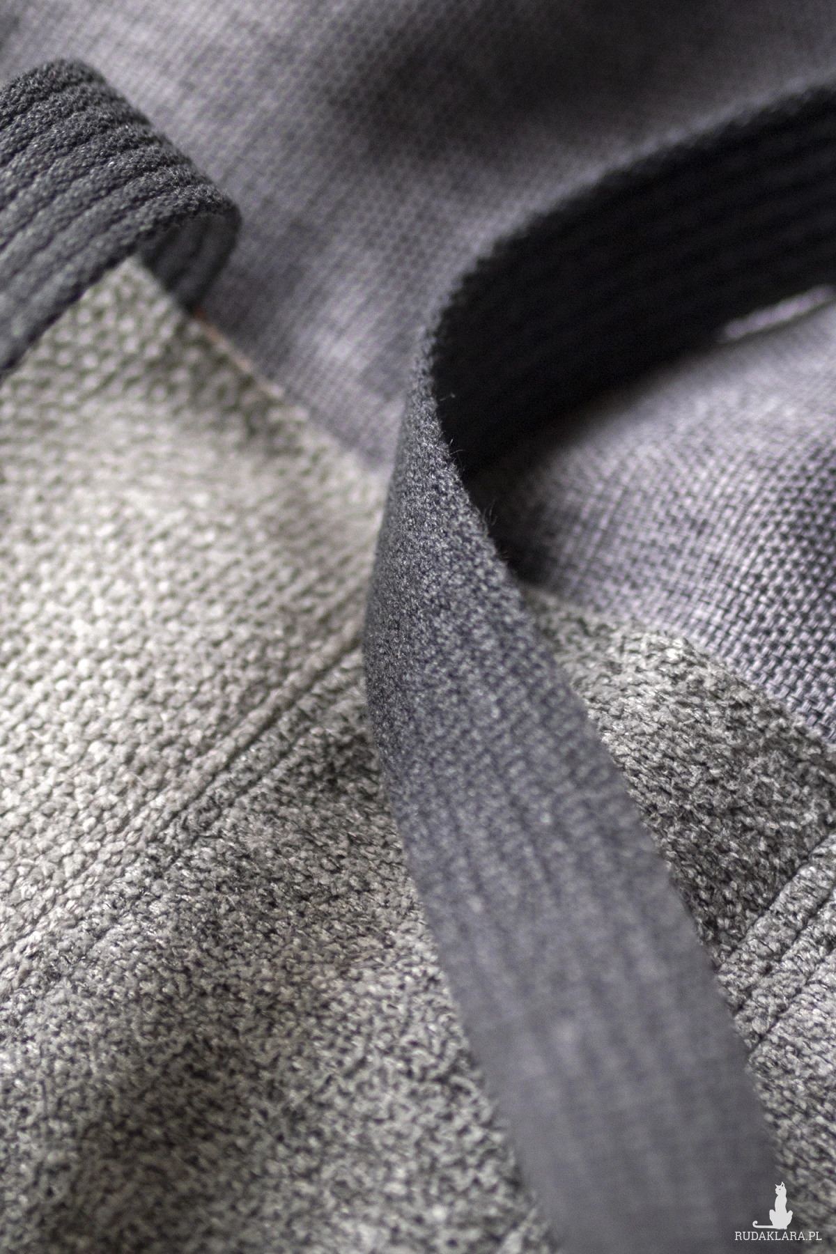 Wykonana z tkaniny w kolorze szarym. Bawełniane, grafitowe pasy i biała, bawełniana podszewka w kapibary.