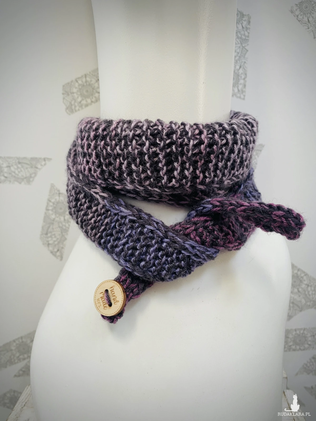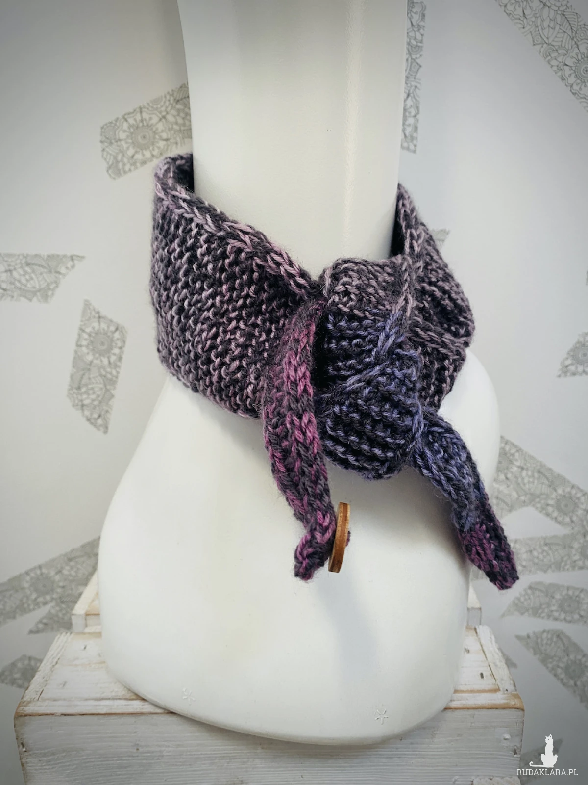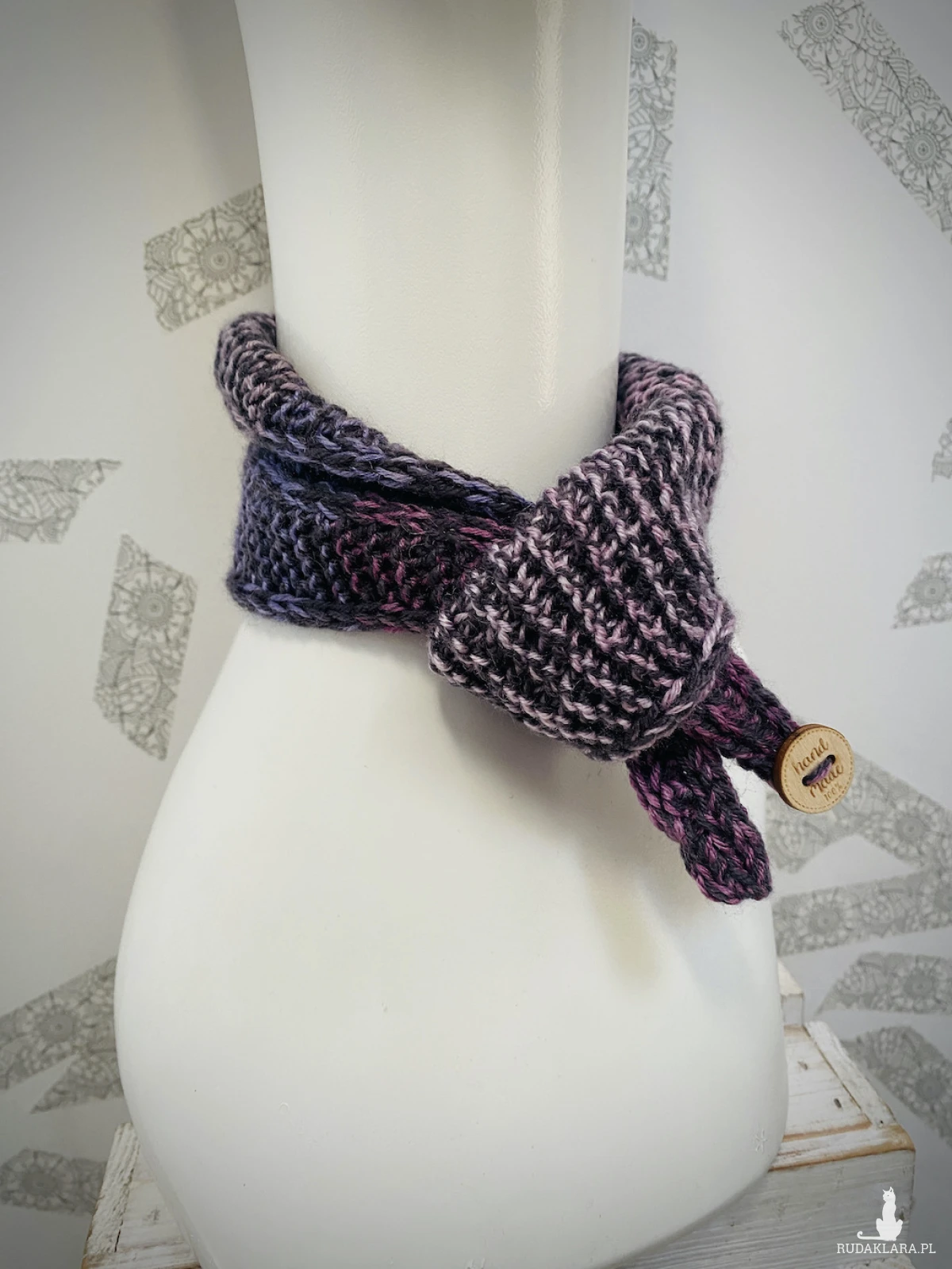 Ręcznie robiony na drutach dzianinowy szalik o krótkiej, wiązanej formie.