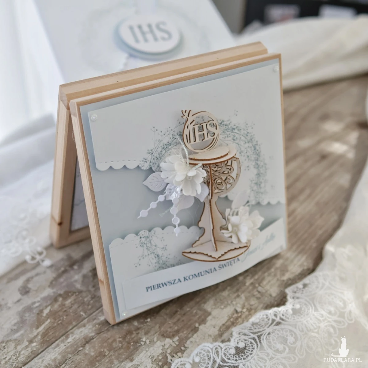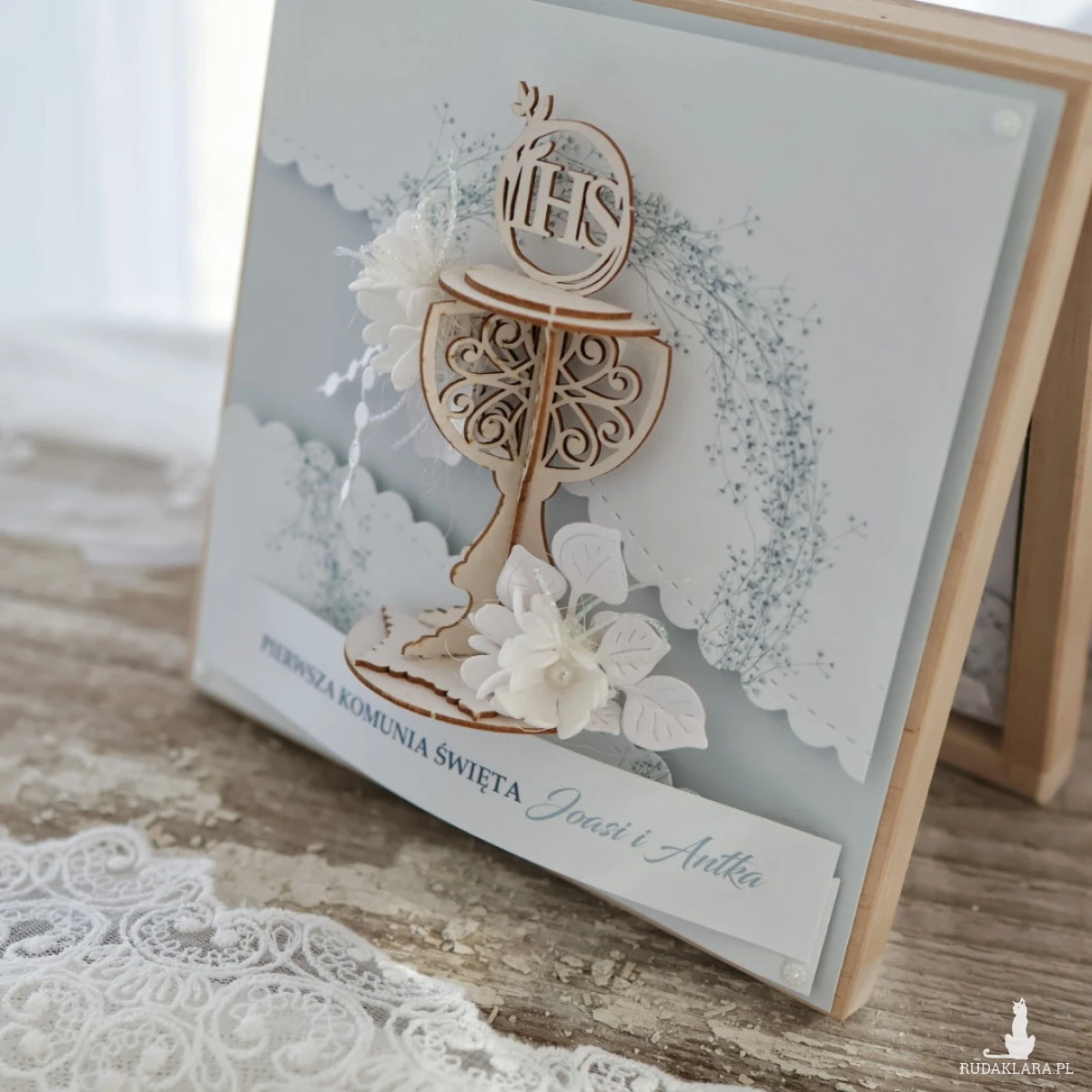 Wyjątkowa pamiątka Pierwszej Komunii Świętej w drewnianym pudełku to elegancki prezent, który pozostanie piękną pamiątką na lata. Kartka ozdobiona jest z przodu dekoracyjnym kielichem 3D oraz delikatną kompozycją kwiatową.