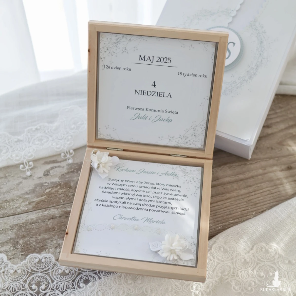 W środku znajdują się życzenia oraz subtelne dekoracje kwiatowe. Możesz wybrać kartkę z kalendarza z datą uroczystości lub zdjęcie dziecka. Dodatkowo istnieje możliwość dodania kieszonki na pieniądze.