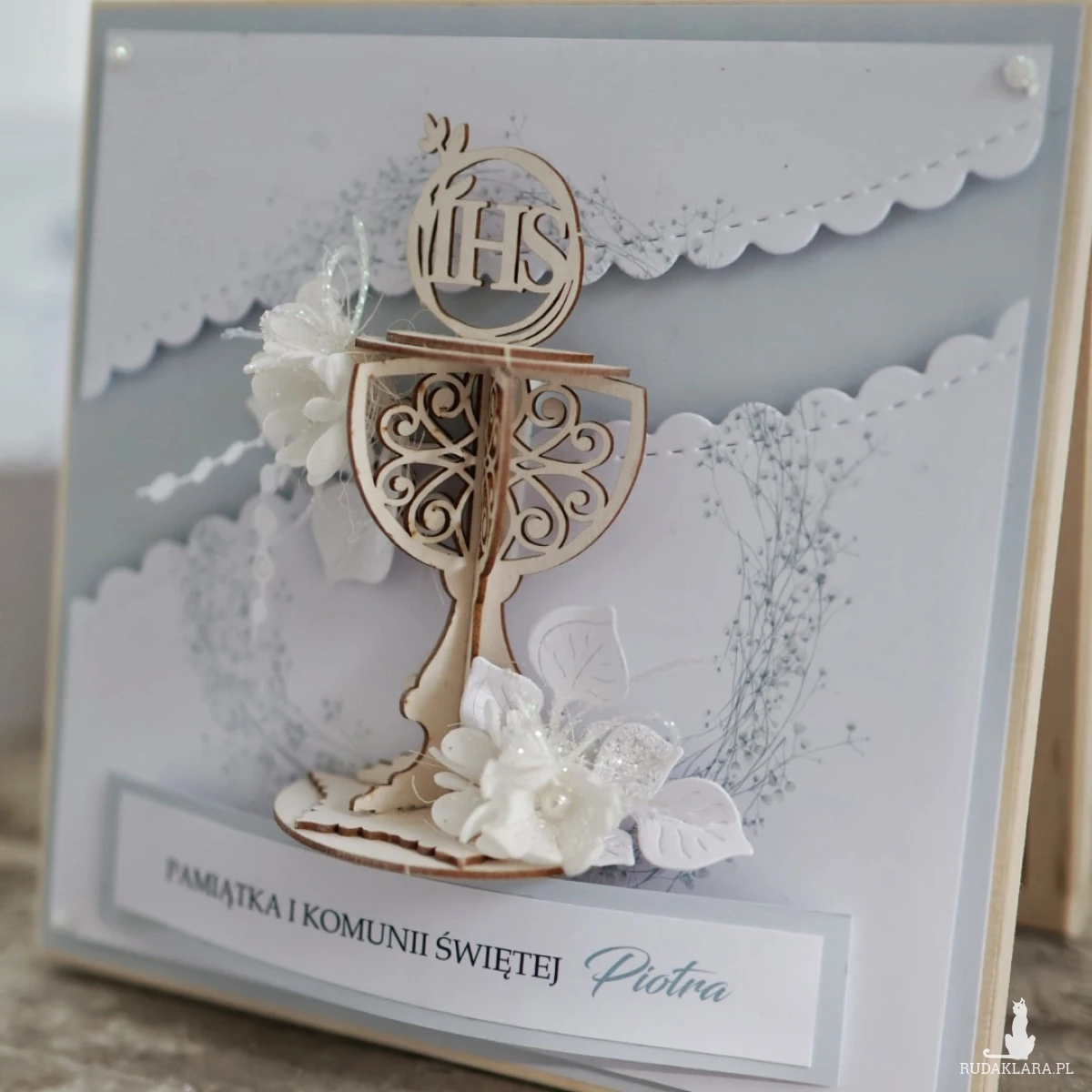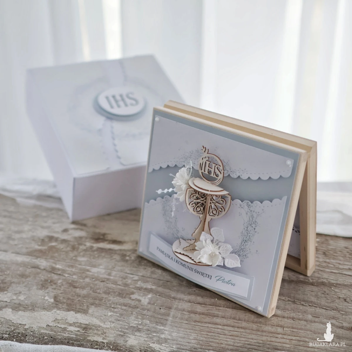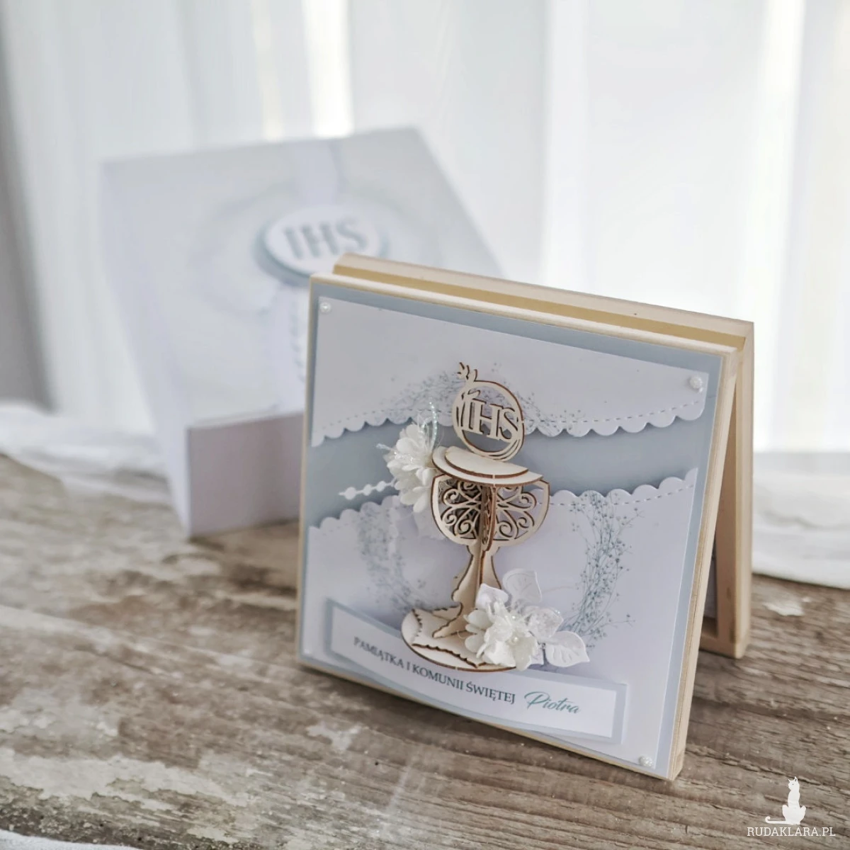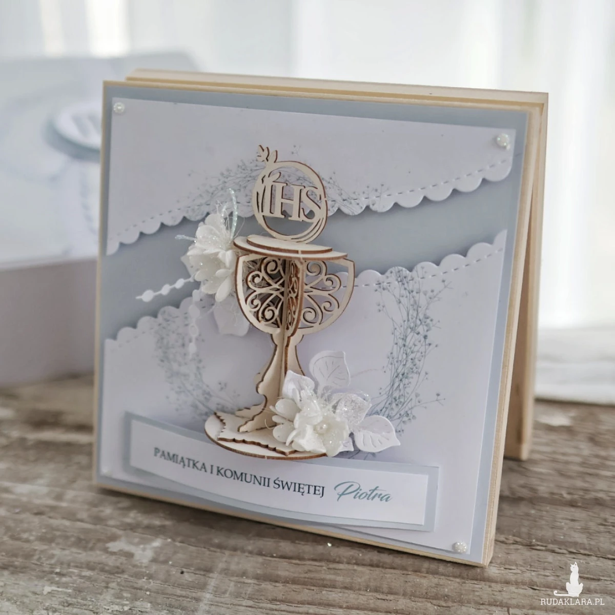Wyjątkowa pamiątka Pierwszej Komunii Świętej w drewnianym pudełku to elegancki prezent, który pozostanie piękną pamiątką na lata. Kartka ozdobiona jest z przodu dekoracyjnym kielichem 3D oraz delikatną kompozycją kwiatową.