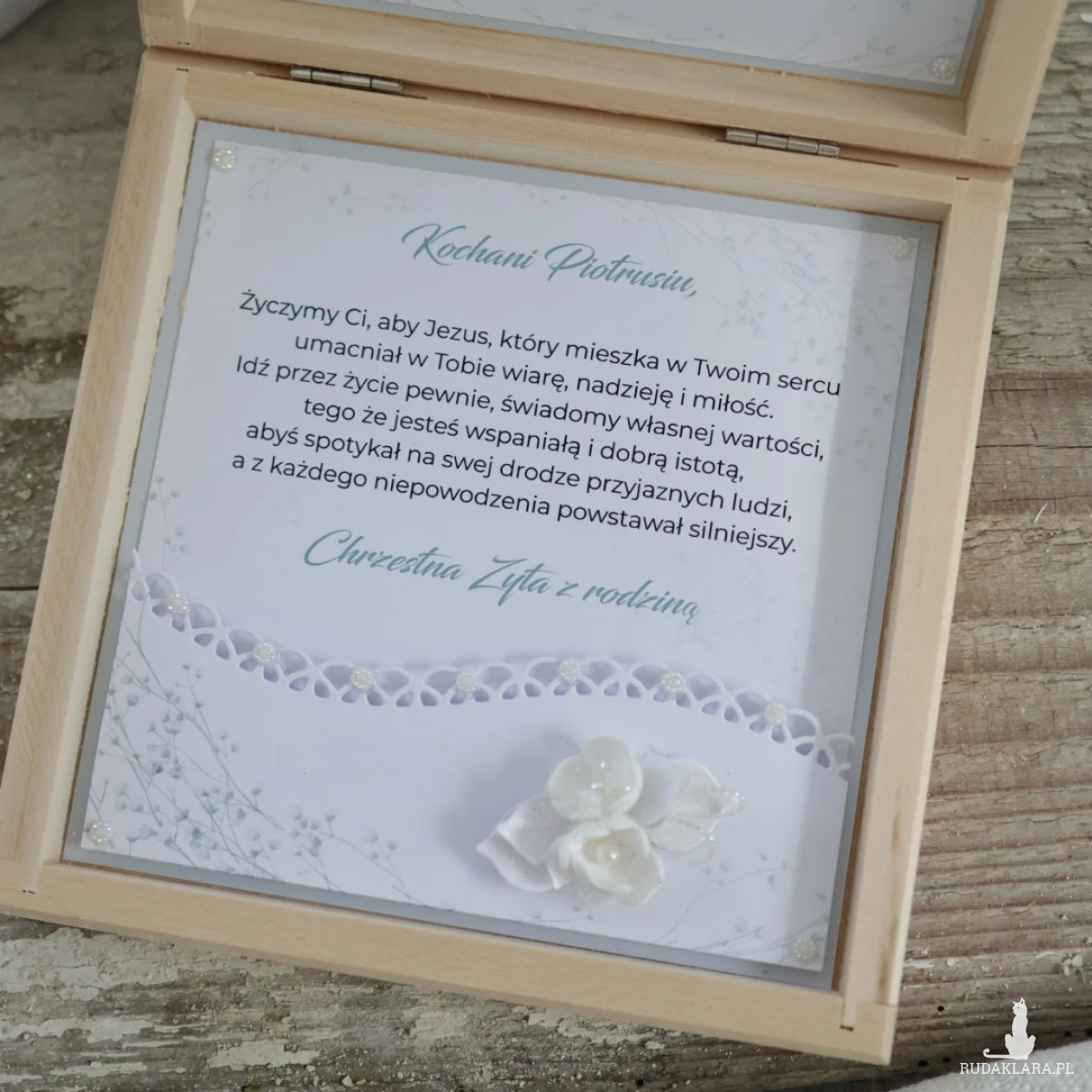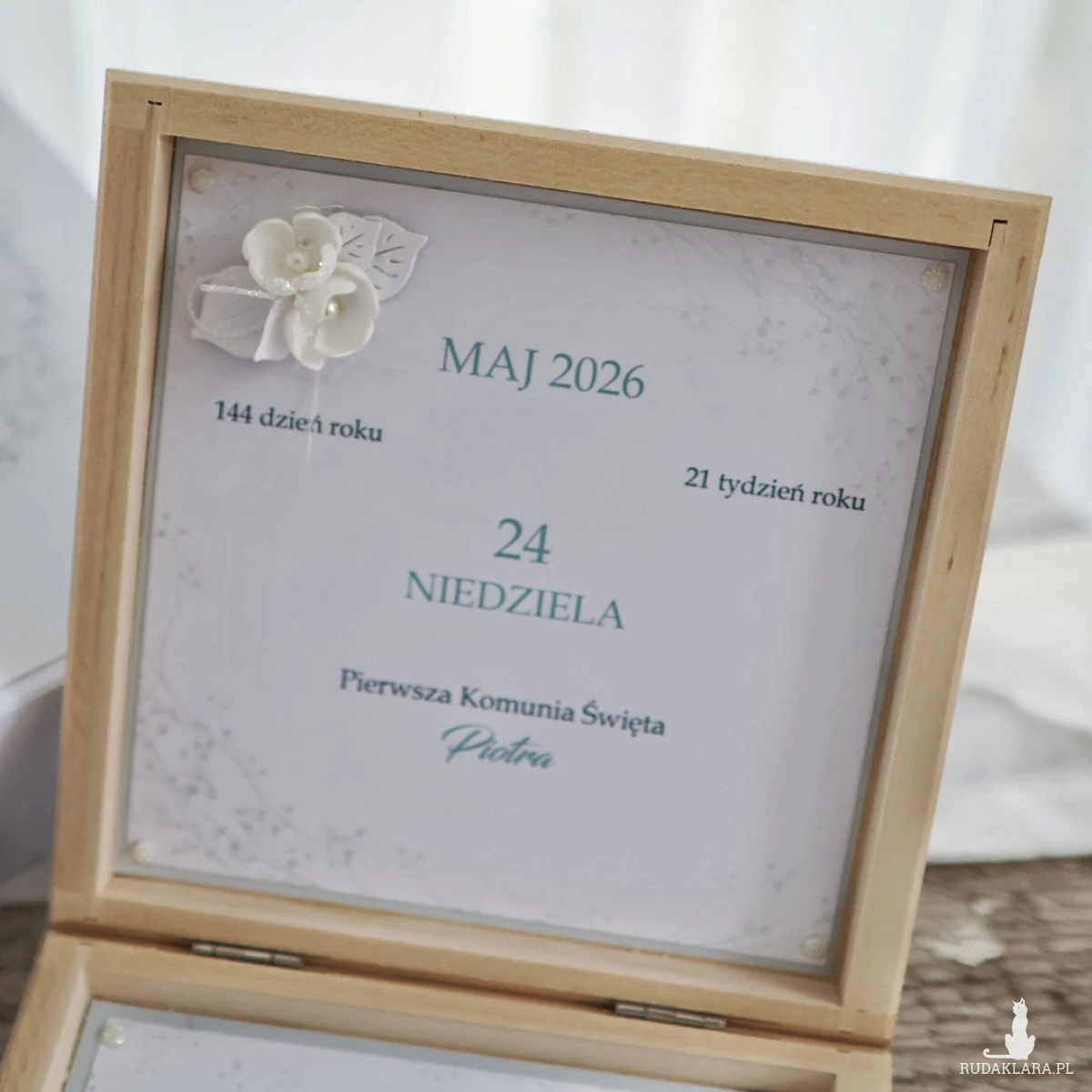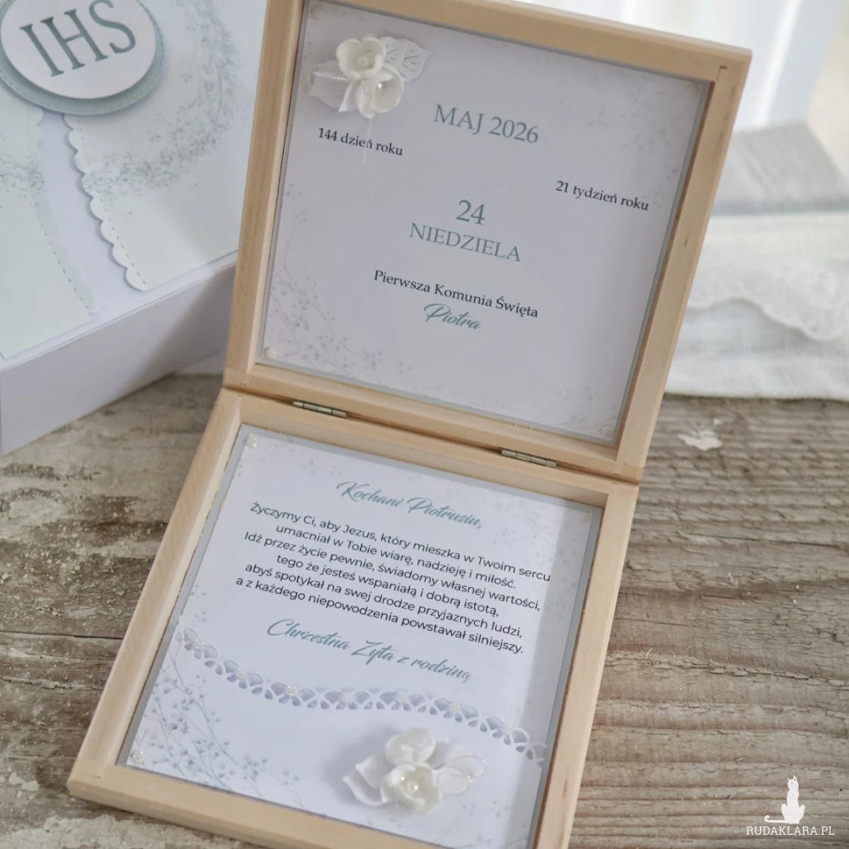 W środku znajdują się życzenia oraz subtelne dekoracje kwiatowe. Możesz wybrać kartkę z kalendarza z datą uroczystości lub zdjęcie dziecka. Dodatkowo istnieje możliwość dodania kieszonki na pieniądze.