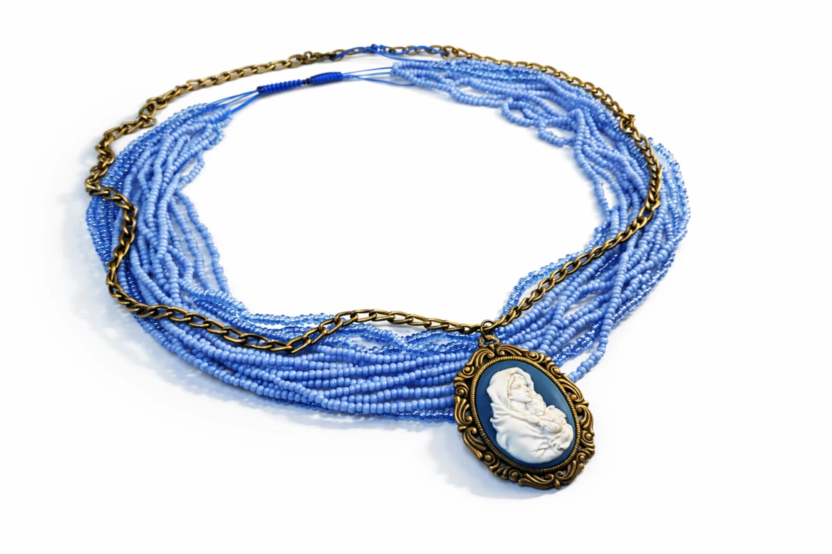 Sercem naszyjnika jest owalna kamea osadzona w ozdobnej, metalowej ramie