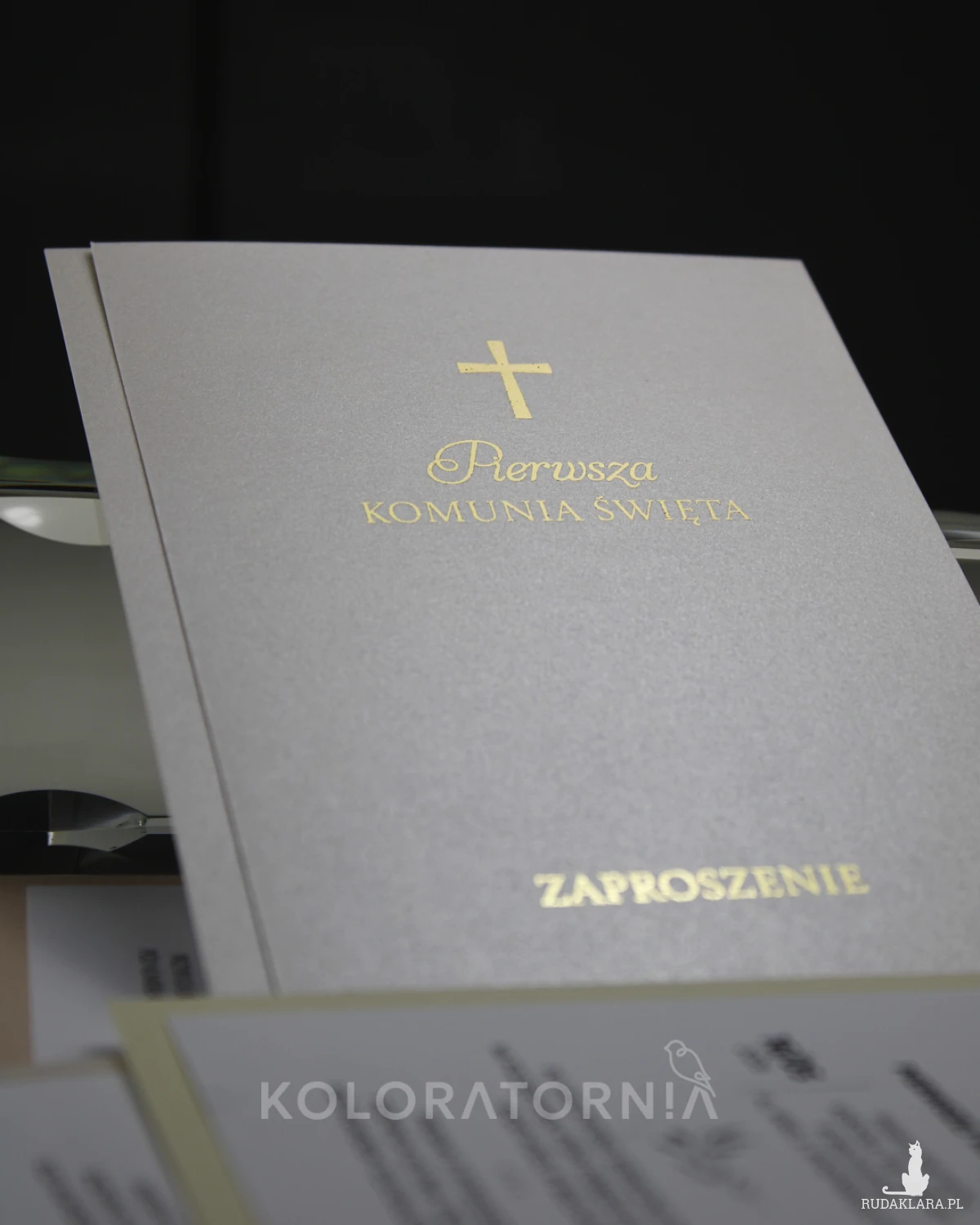 Zaproszenie na imprezę z okazji Pierwszej Komunii Świętej ze złoceniem.