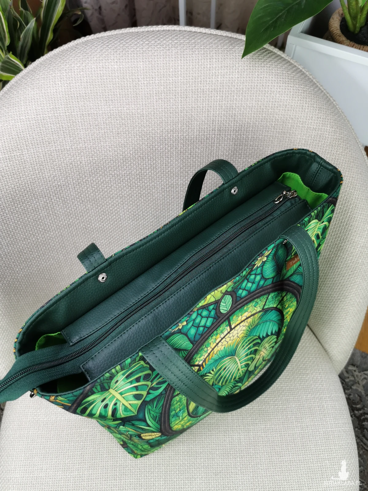 Wewnątrz gładka podszewka wodoodporna w kolorze jasno zielonym, dwie pojemne kieszenie, na zamek i wsuwana.