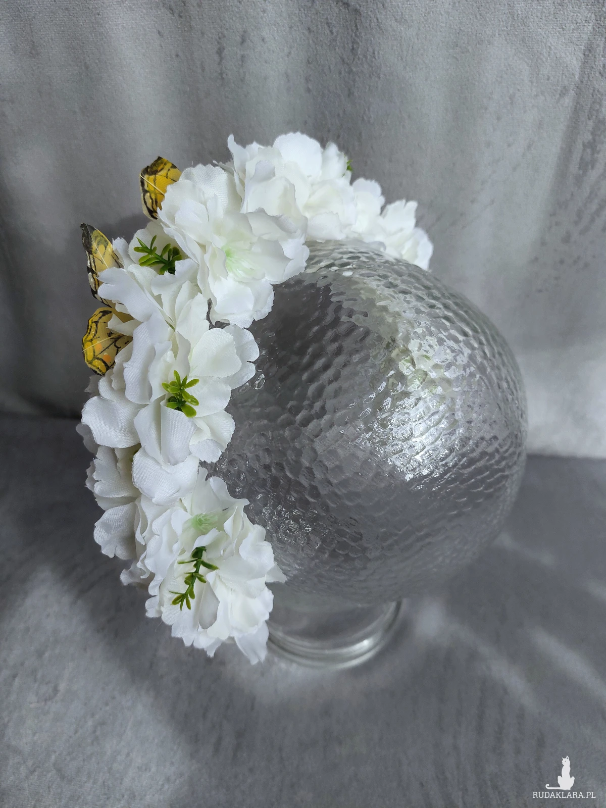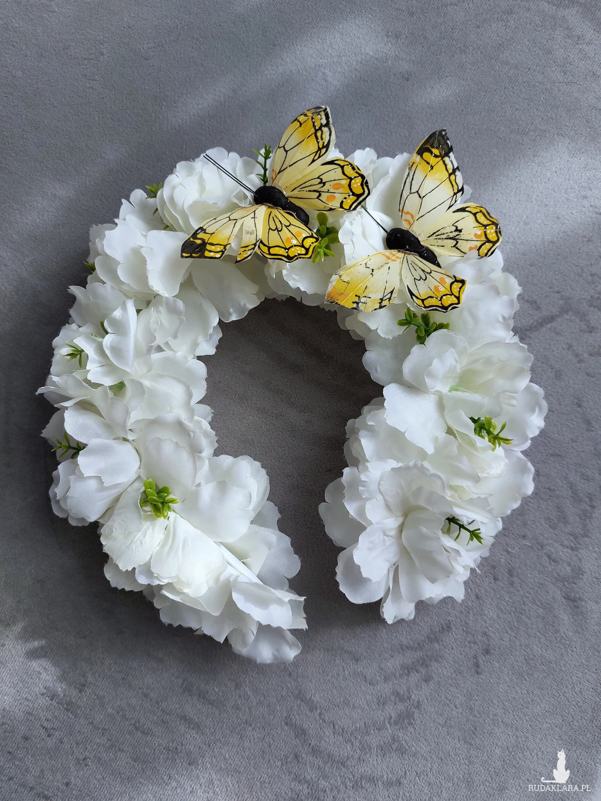 Kwiatowa opaska, wiosenny wianek wykonany z białych kwiatów jabłoni, ozdobiony dwoma żółtymi motylami. Kwiaty umocowane są na wygodnej opasce pokrytej satyną, Rozmiar uniwersalny, pasuje zarówno na dorosłą jak i na dziecięcą głowę.