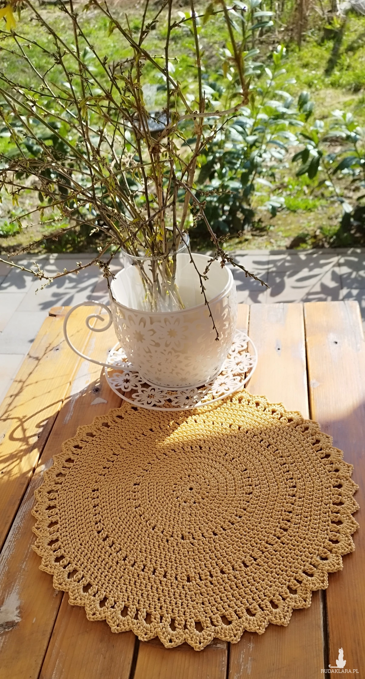 Piękna, ręcznie wykonana serweta ze sznurka poliestrowego w eleganckim złotym kolorze. Starannie szydełkowana, z ozdobnym ażurowym wykończeniem, które nadaje jej lekkości i wyjątkowego charakteru.