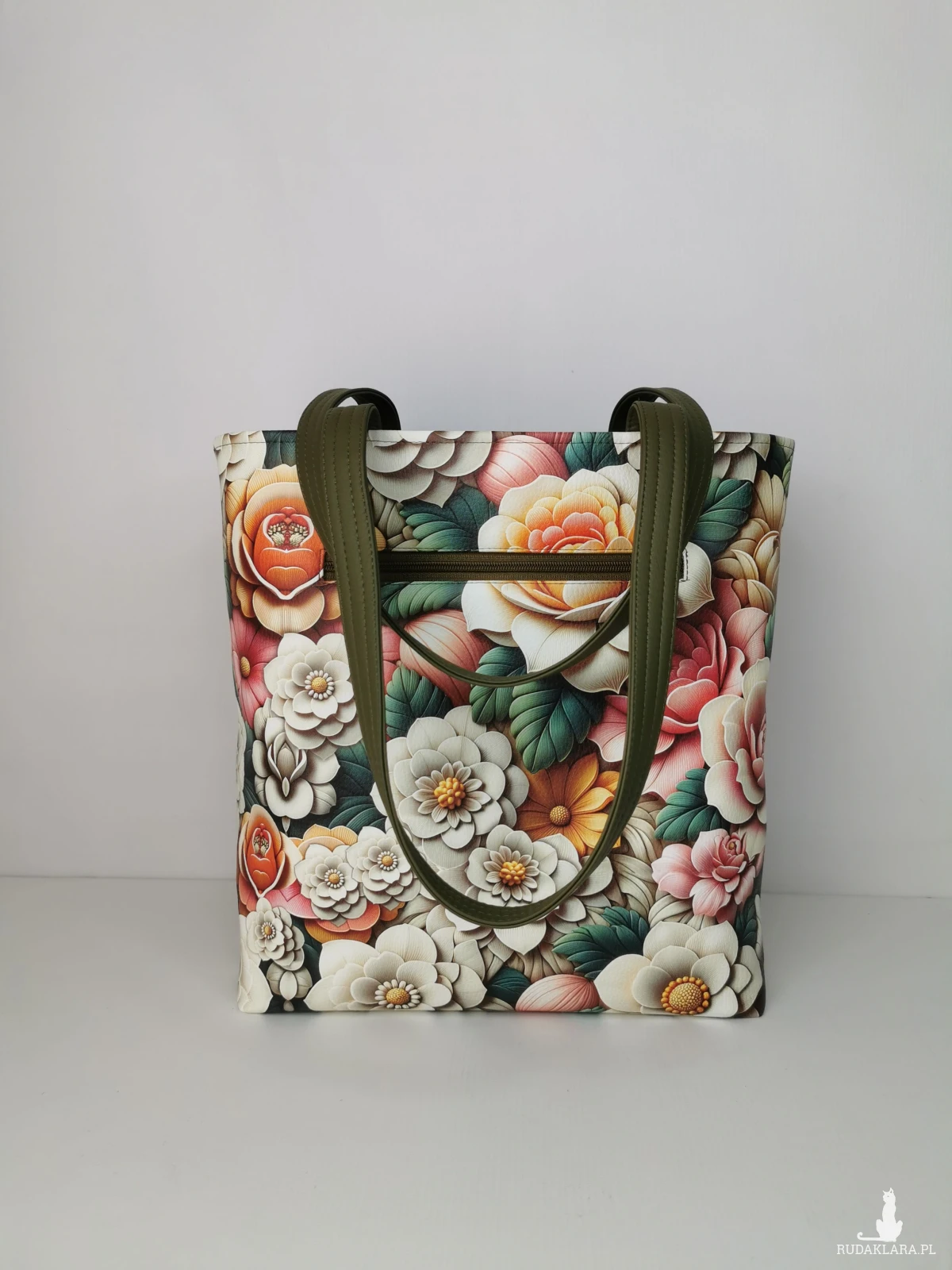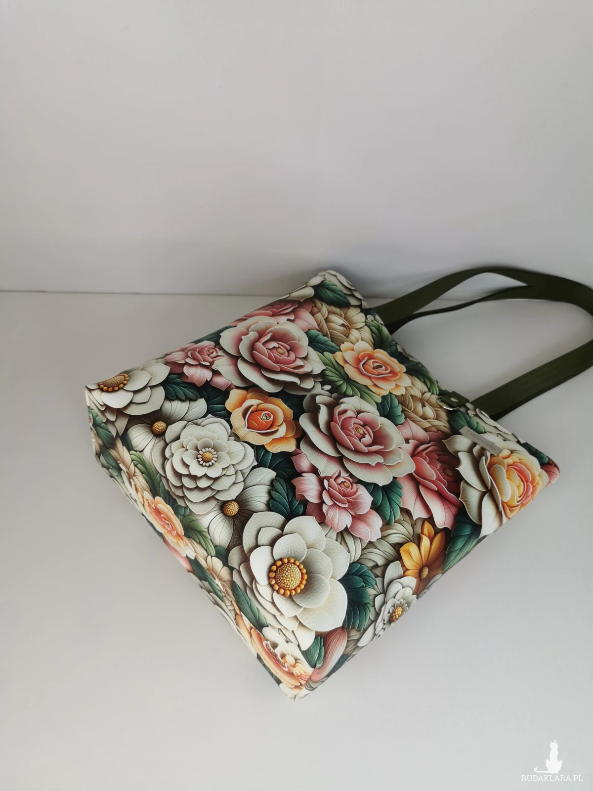 Wykonana z ekoskóry w kwiaty ( przód i tył torebki ) , uchwyty wykonane z gładkiej ekoskóry w kolorze zielonym / khaki .