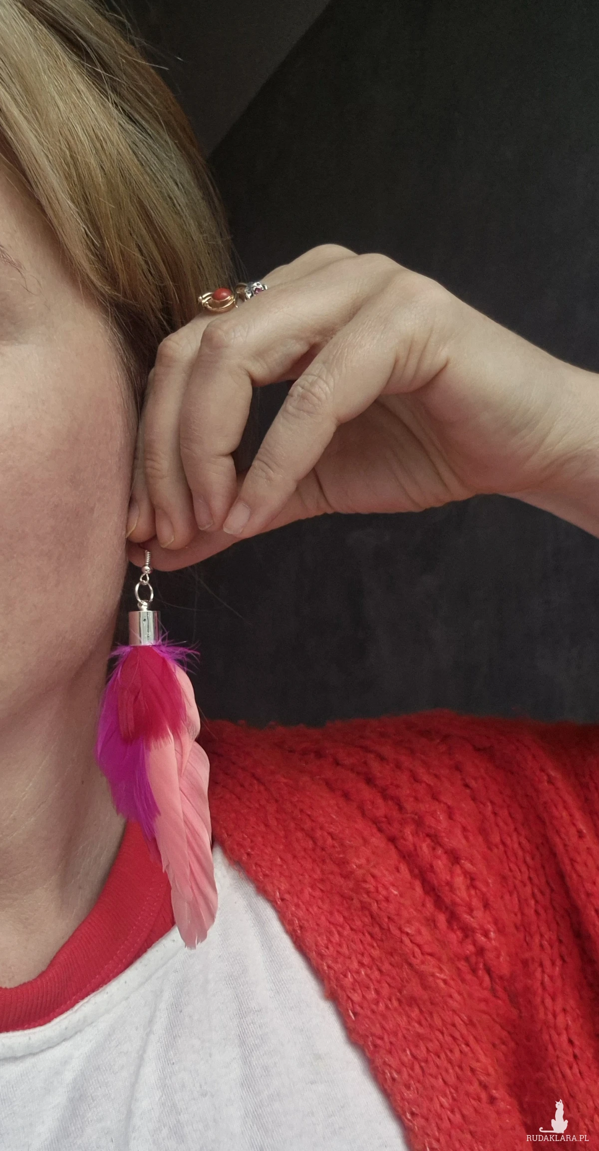 Kolczyki czerwono rózowe pióra rękodzieło polecam