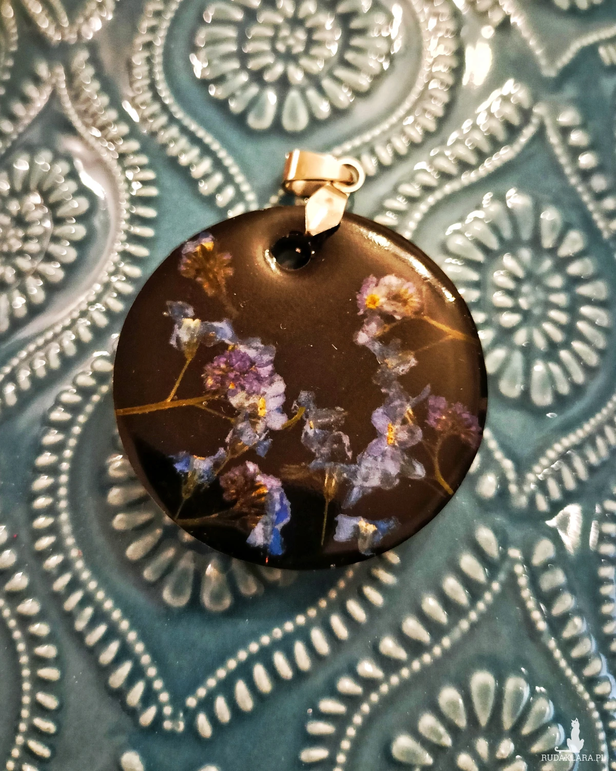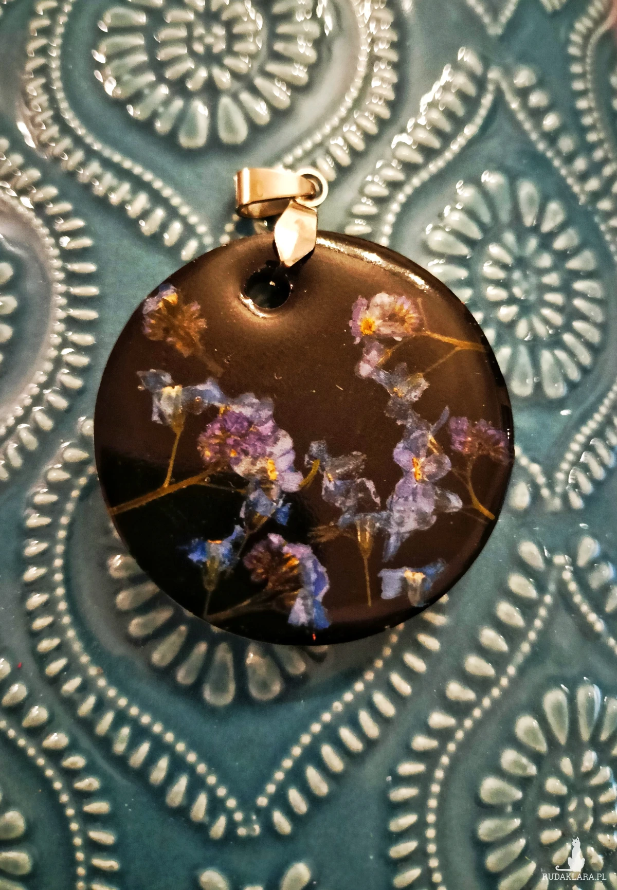 wisiorek z żywicy handmade, wisiorek z niezapominajkami, biżuteria z prawdziwymi kwiatami, zawieszka z żywicy UV, naszyjnik z kwiatami, biżuteria naturalna handmade, prezent dla kobiety, czarna biżuteria z żywicy, biżuteria z suszonymi kwiatami