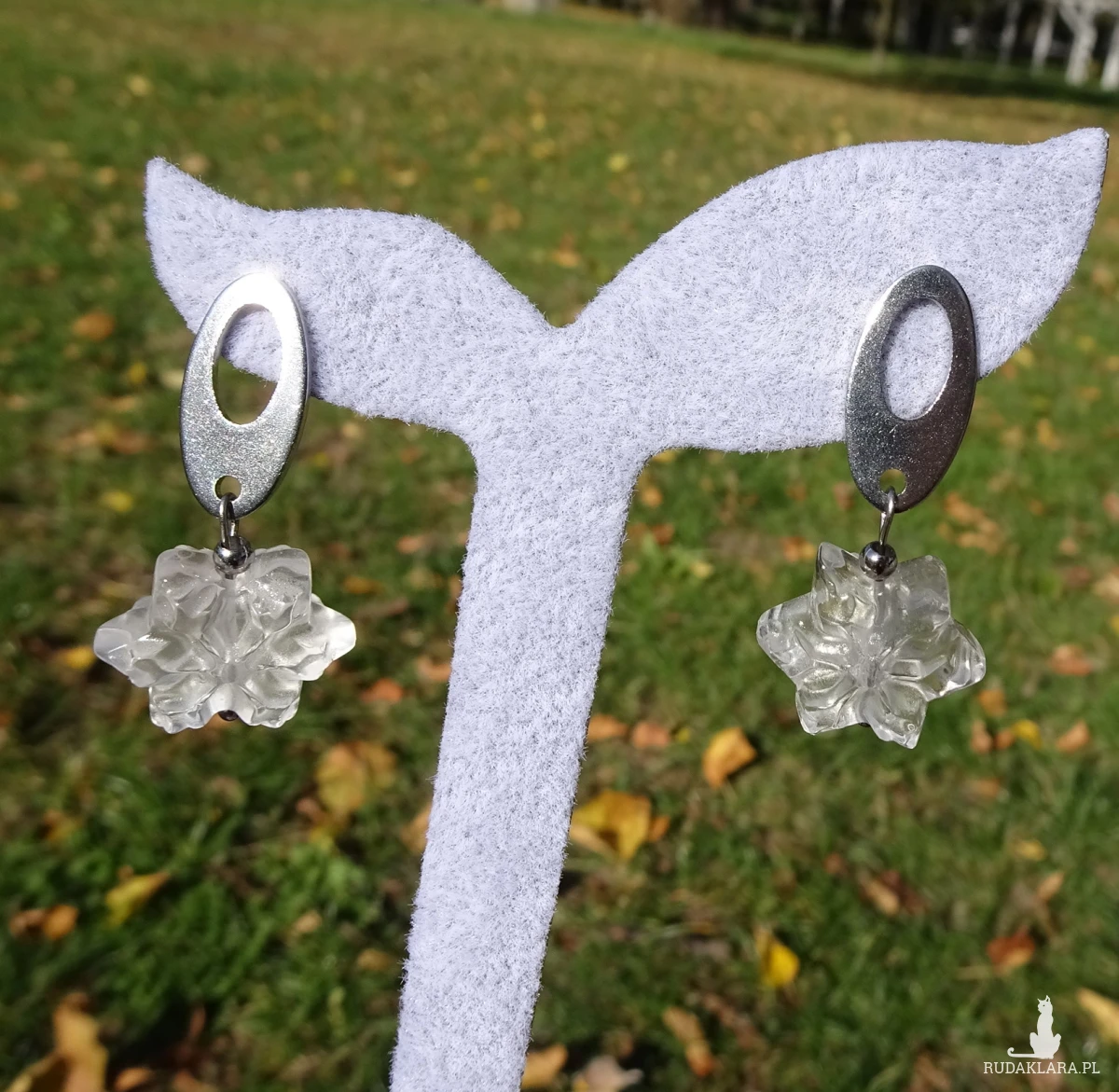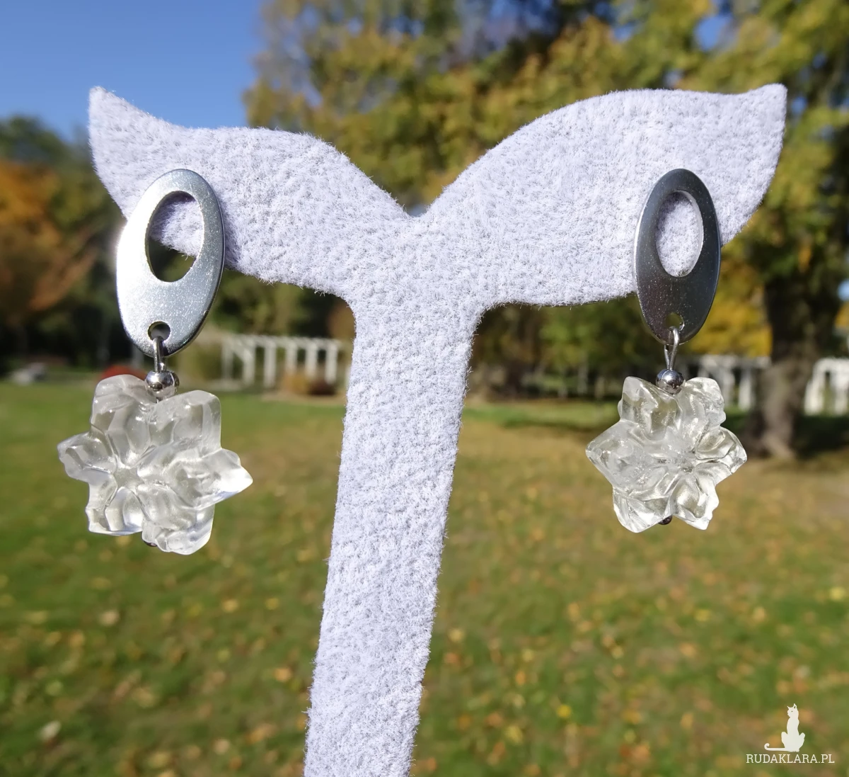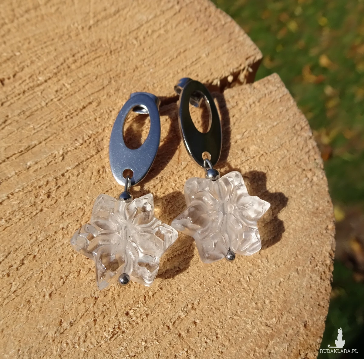 Kolczyki w kształcie płatka śniegu z kryształu górskiego i elementów z nieuczulającej stali chirurgicznej. Długość całkowita ok. 4cm. Na zdjęciach sprzedawana para.