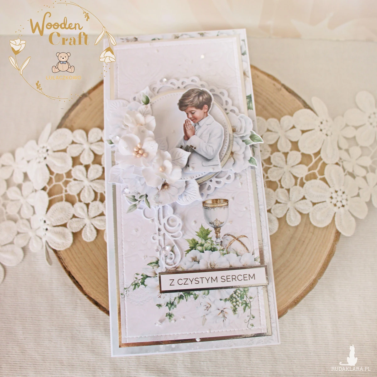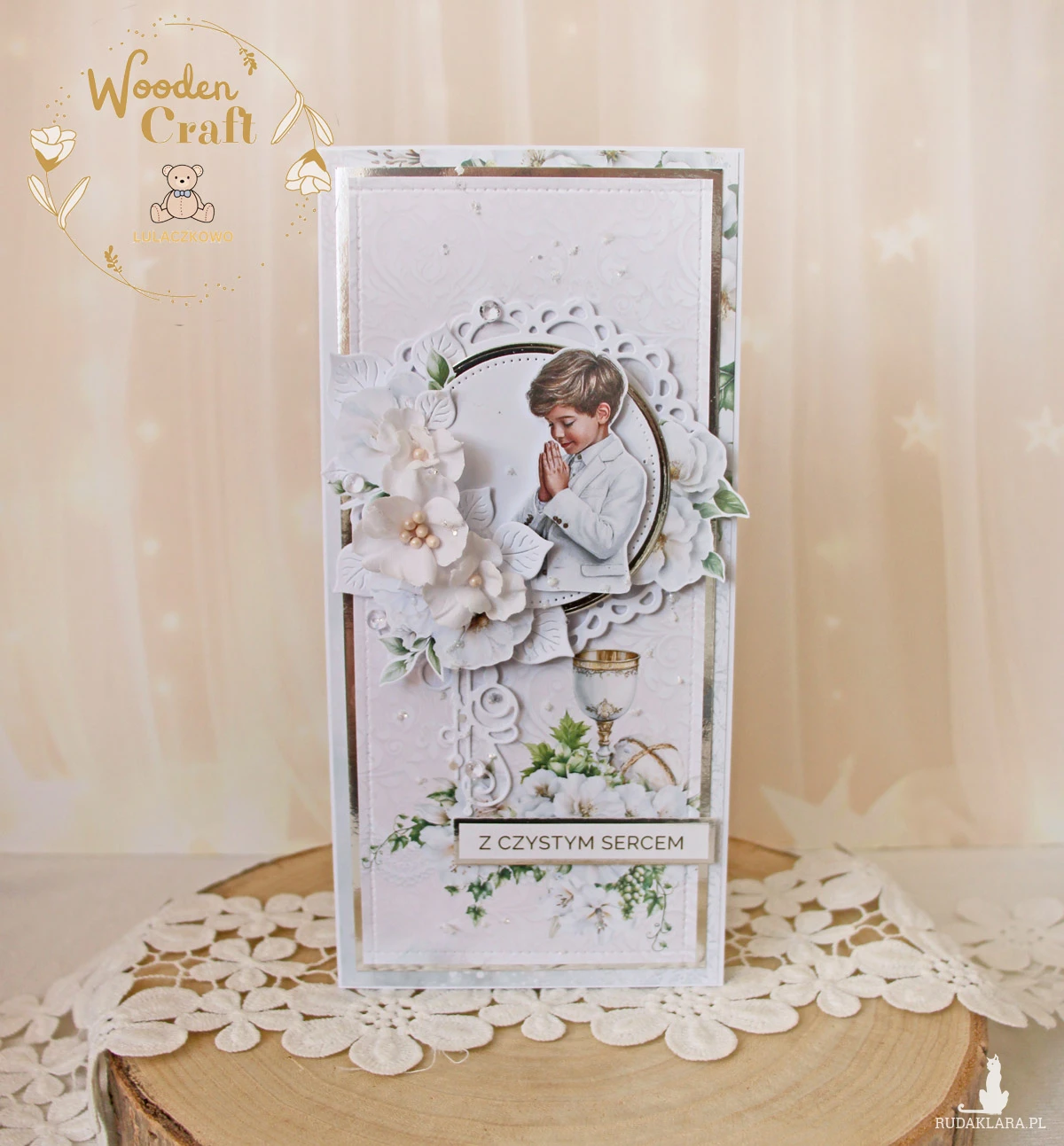 Piękna i elegancka pamiątka Pierwszej Komunii Świętej zamknięta w białym pudełeczku z okienkiem, wykonana ręcznie z najwyższą starannością, z cudownej i delikatnej kolekcji papierów "Holy Communion 4", utrzymana w odcieniach bieli oraz zieleni z dodatkiem srebrnych, błyszczących akcentów. Na środku kartki umieszona została grafika modlącego się chłopca komunijnego, ozdobiona kompozycją kwiatową z ręcznie robionymi kwiatami, udekorowana kryształkami oraz napisem "Z Czystym Sercem"