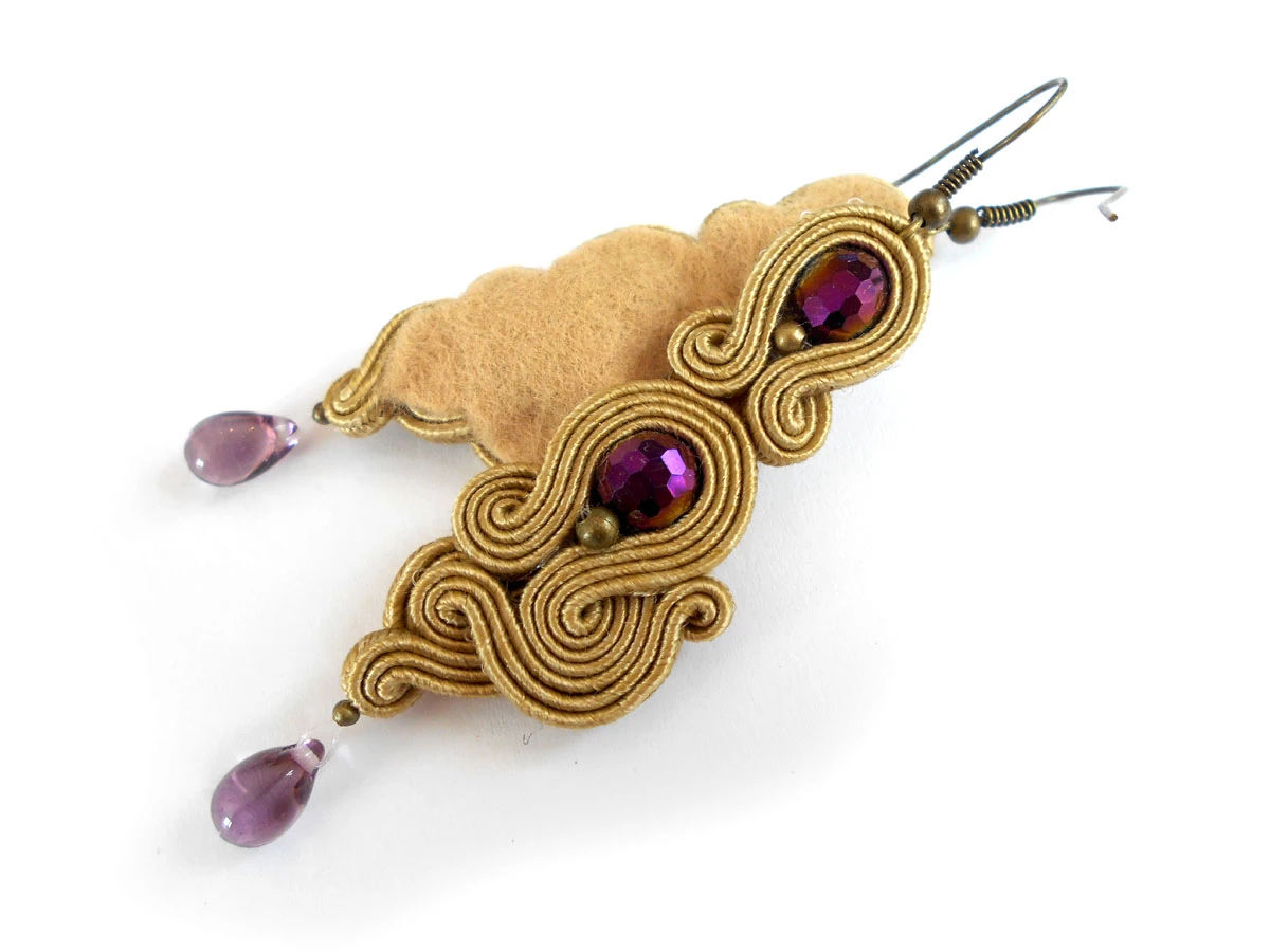 Wykonane z najlepszej jakości sznureczków, fioletowych kryształków oraz szklanych kropelek w kolorze lawendy. Tył starannie wykończony cienkim filcem, dopasowanym kolorystycznie. Całość impregnowana, co w znacznym stopniu zapobiega zabrudzeniom.