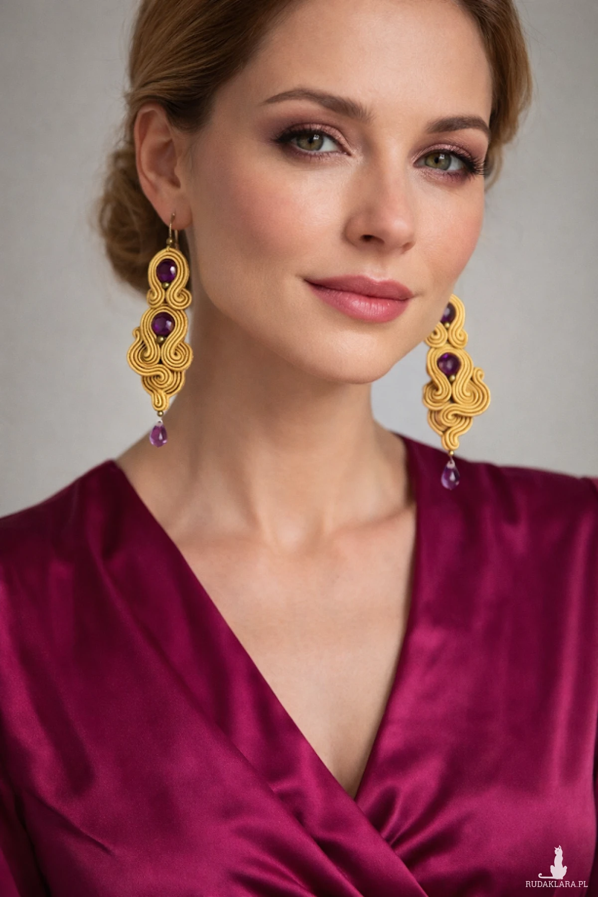 Piękne kolczyki w kolorze złotym z fioletowymi akcentami. Bardzo lekkie i efektowne, idealne na wielkie wyjścia lub jako wyjątkowy prezent.