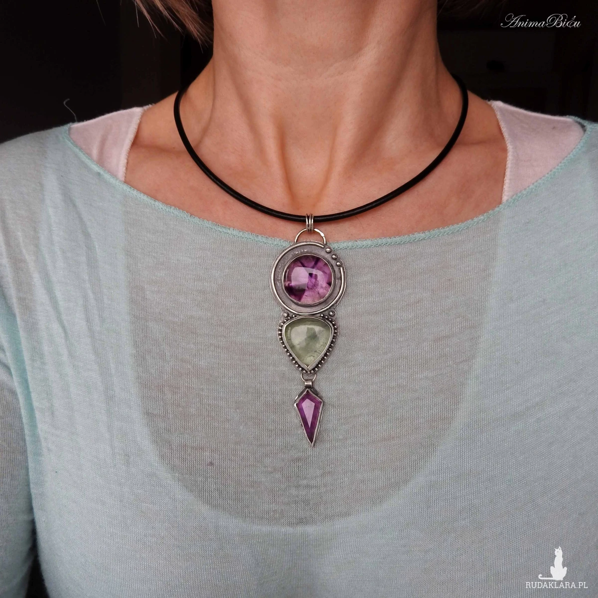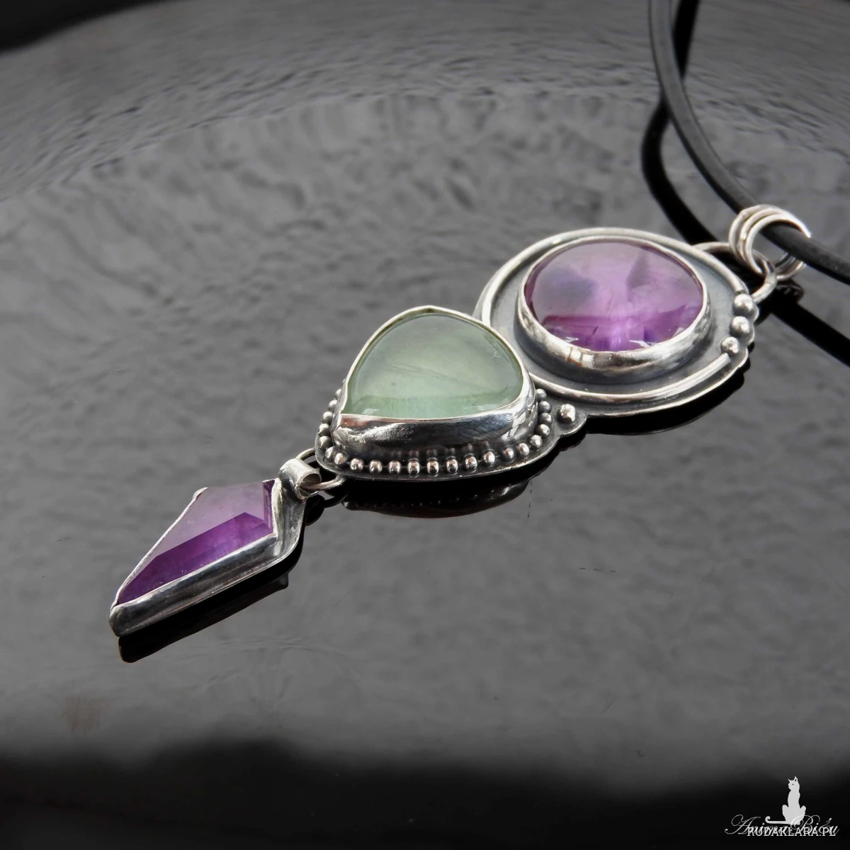 Wisiorek srebrny z ametystem i fluorytem. Wykonałam go od