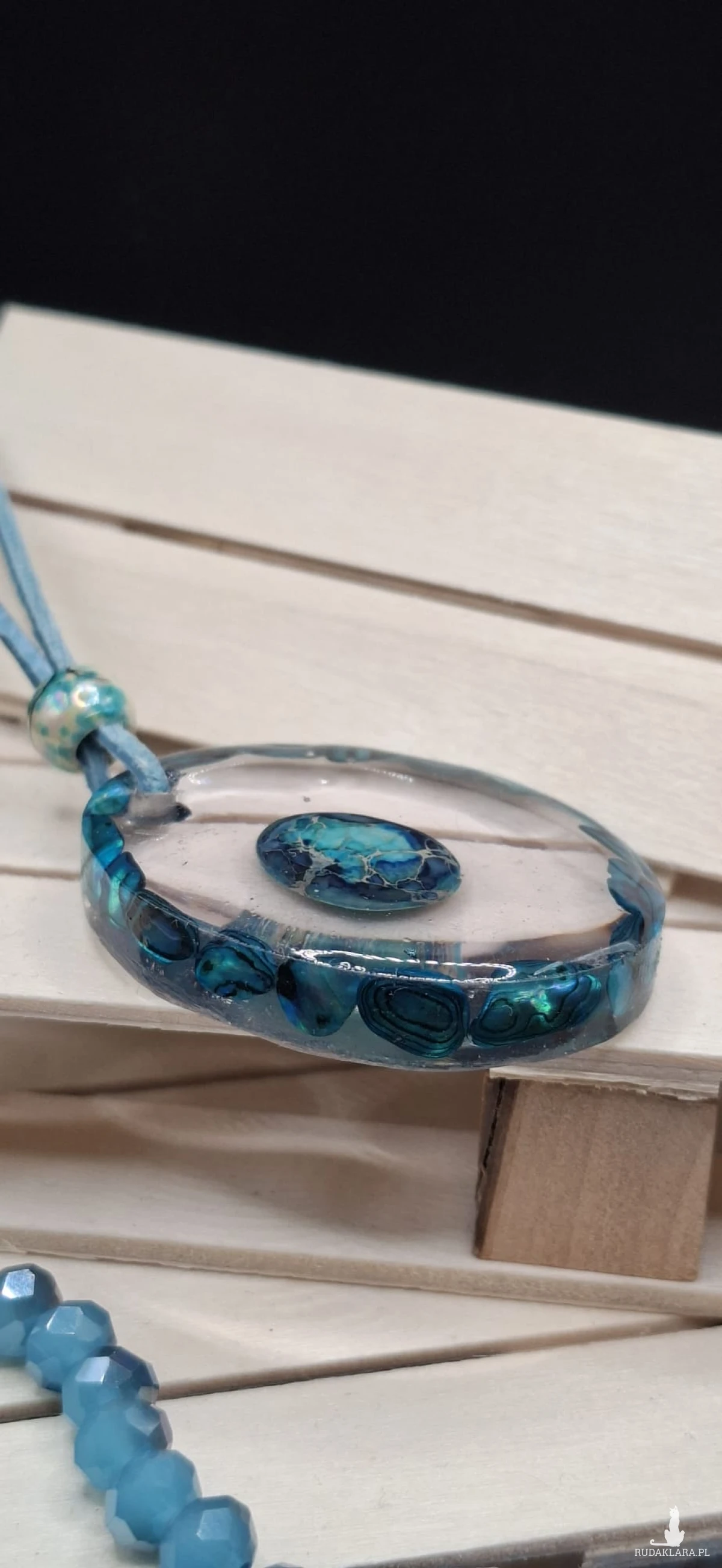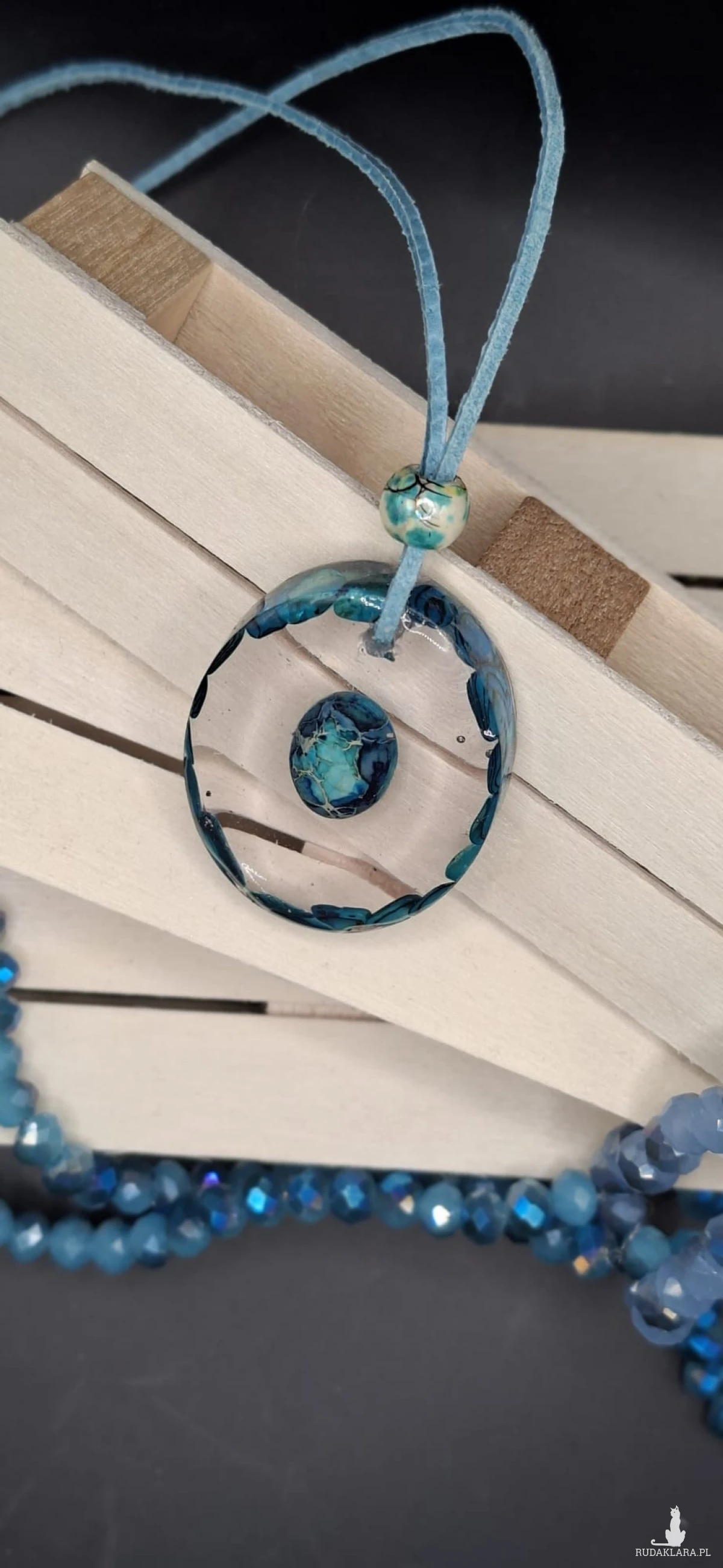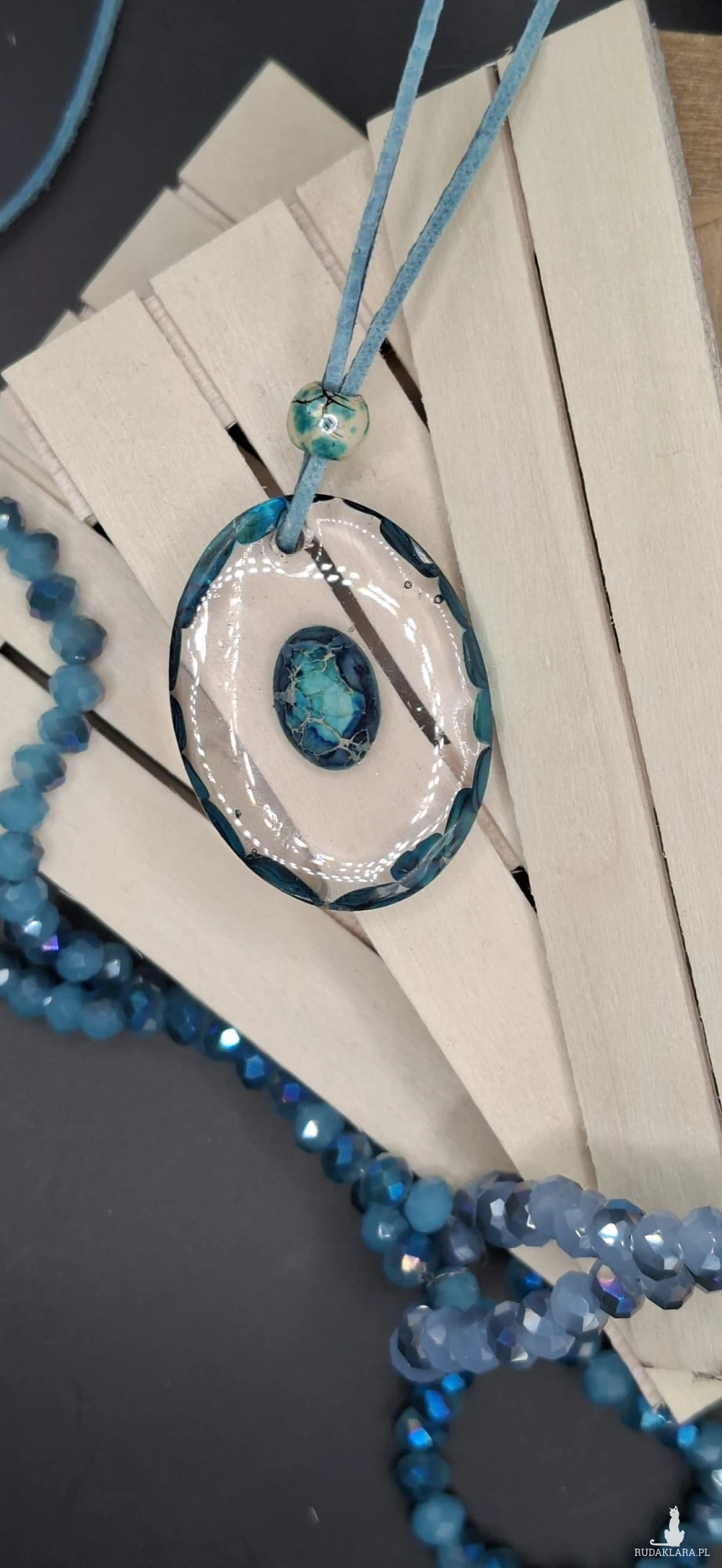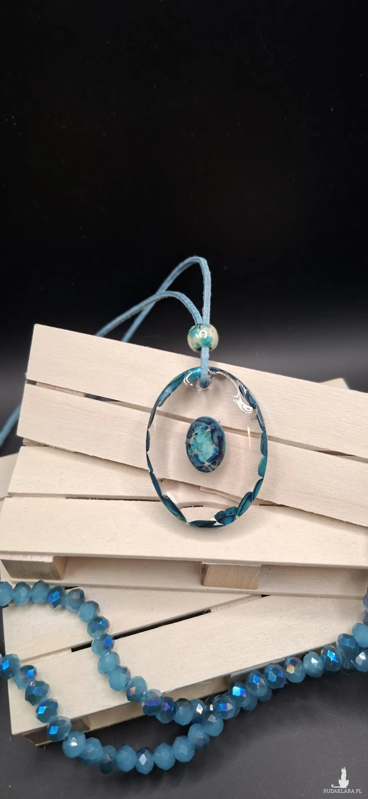 Centralnym elementem jest owalna zawieszka z zatopionym kamieniem w odcieniach turkusu i granatu, przypominającym strukturę naturalnego minerału. Całość została wykończona delikatną ramką w turkusowym kolorze, która podkreśla głębię kompozycji. Zawieszka zawieszona jest na dopasowanym, jasnoniebieskim rzemieniu z ozdobnym koralikiem.