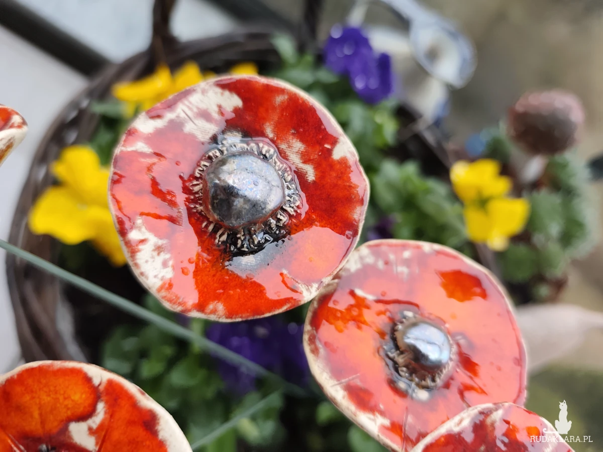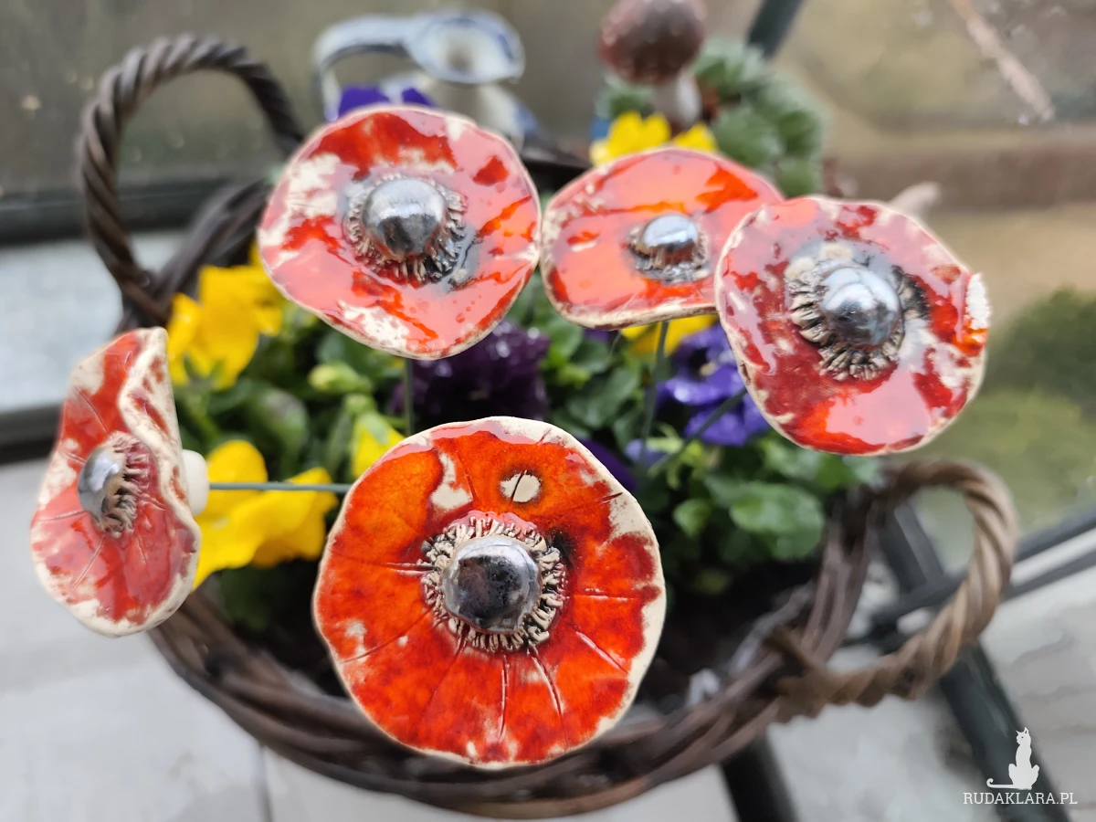 Kwiaty ceramiczne 5 szt, wykonane ręcznie z gliny szamotowej, szkliwione i dwukrotnie wypalane w piecu ceramicznym na 1050 stopni. Polecam do domu, na balkon lub do ogrodu. Średnica około 6 cm. Nie przekwitają :)