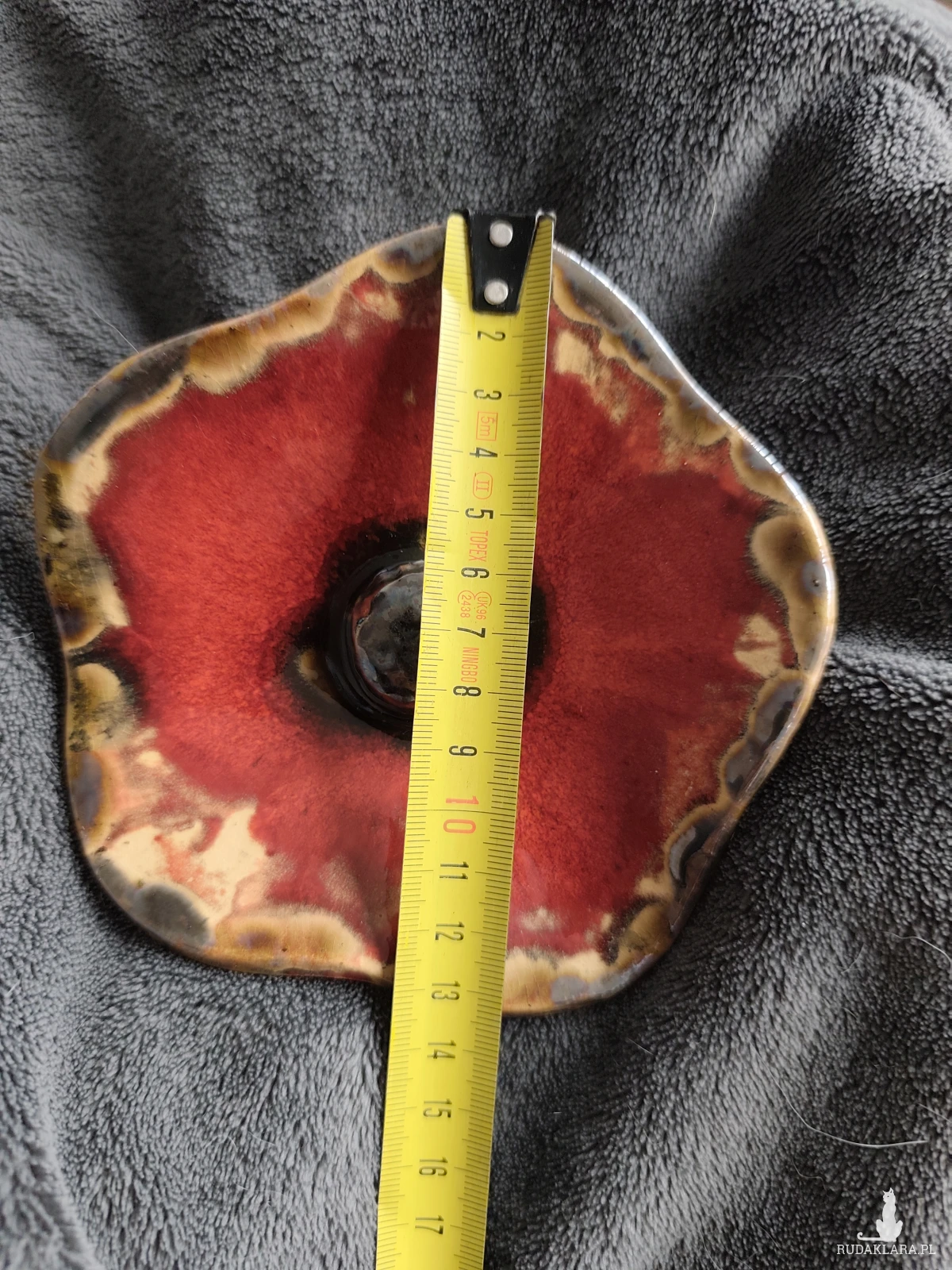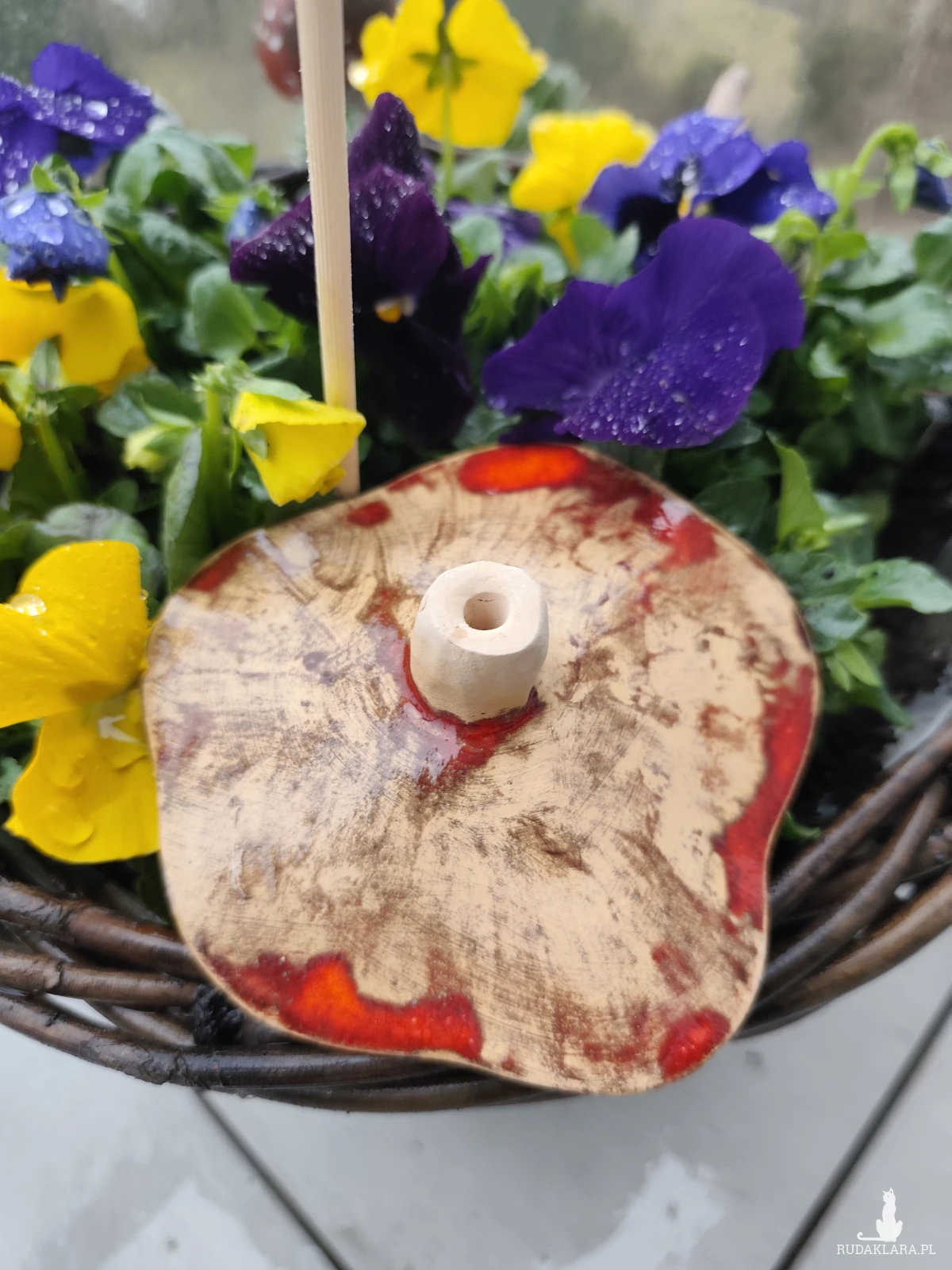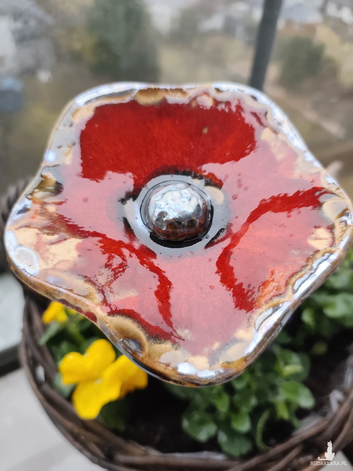 Kwiat ceramiczny, wykonany ręcznie z gliny szamotowej, szkliwione i dwukrotnie wypalane w piecu ceramicznym na 1050 stopni. Polecam na balkon lub do ogrodu. Średnica 14 cm. Zamontowane na tyczce bambusowej. Nie przekwitają :)
