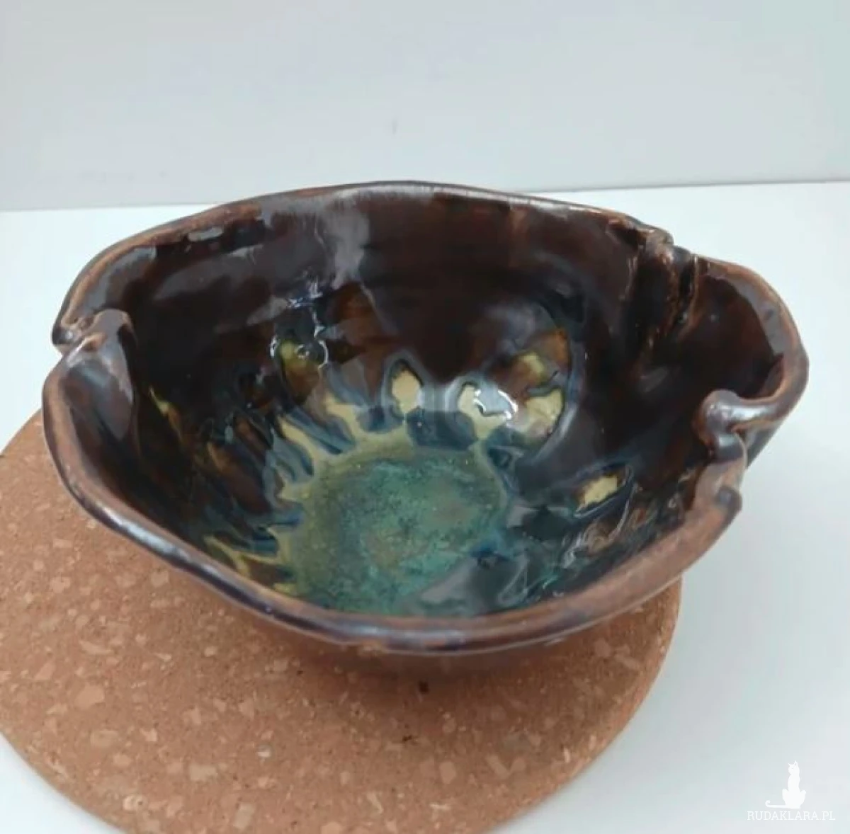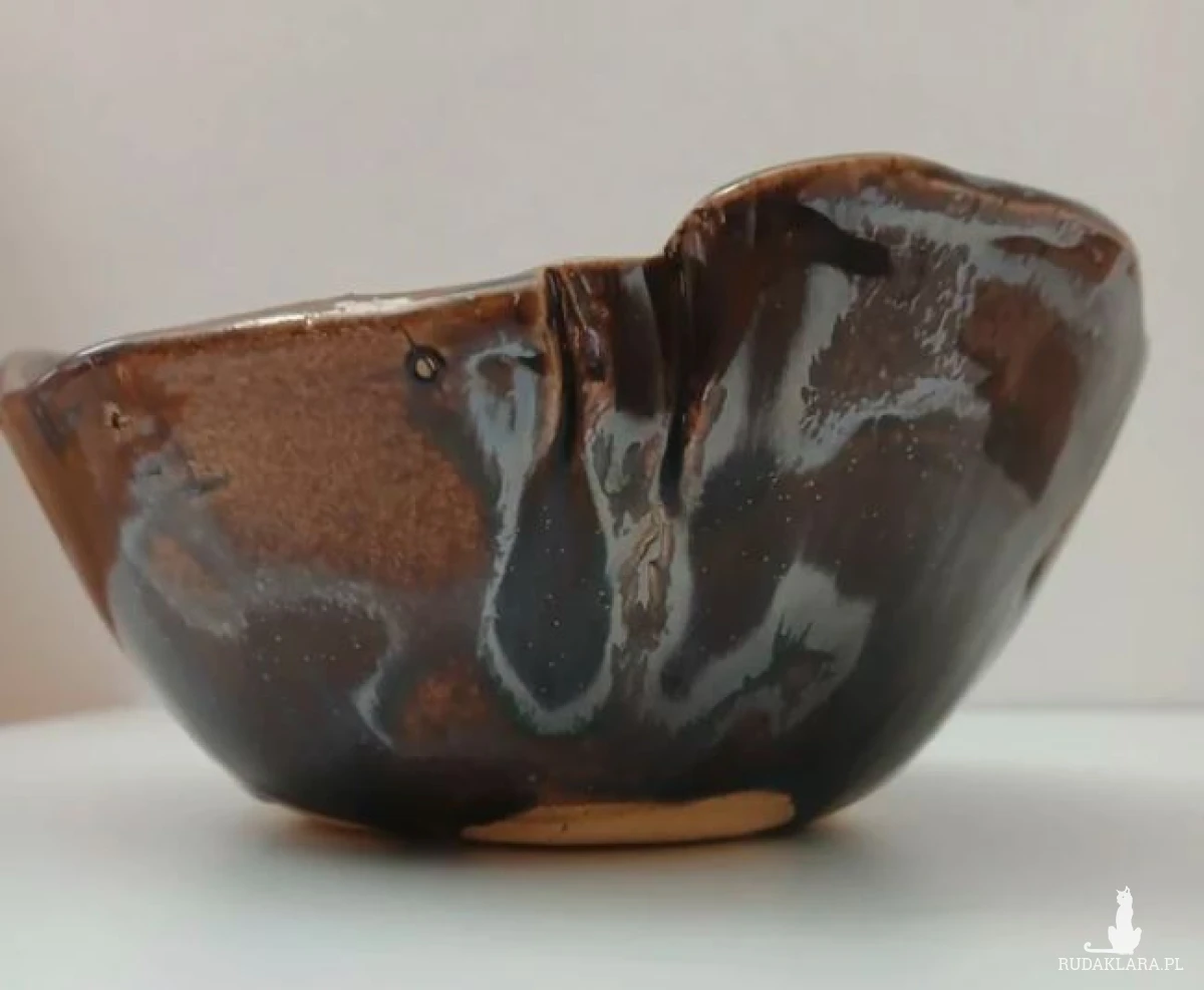 Ręcznie lepiona gliniana miska na owoce lub do serwowania przekąsek, miska na biżuterię i inne drobiazgi, ceramiczna patera na przekąski nieregularne pofalowane brzegi przypominają kwiat, złoto - brązowe szkliwo z zielonymi akcentami, dwukrotnie wypalana w piecu, szkliwa spożywcze wysokość 7cm średnica 15cm