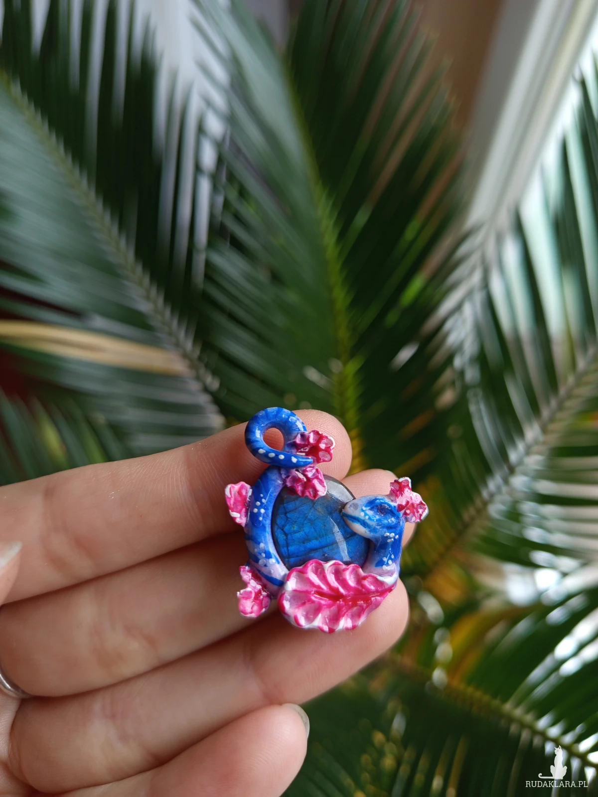 Ten wyjątkowy naszyjnik przedstawia małego smoka oplecionego wokół naturalnego labradorytu. Rzeźba smoka została ręcznie wykonana z glinki polimerowej z dbałością o drobne detale łusek i skrzydeł, nadając całości baśniowy, magiczny charakter.