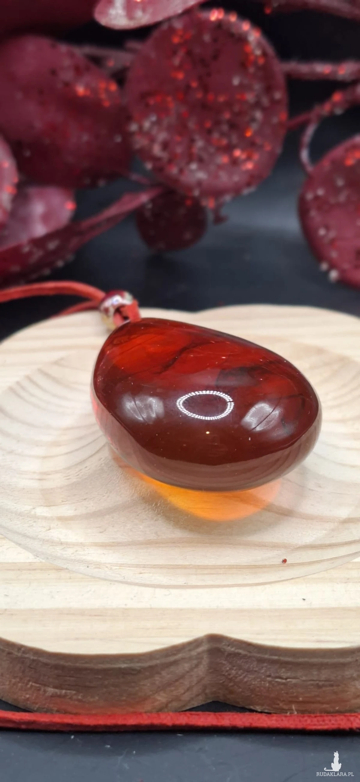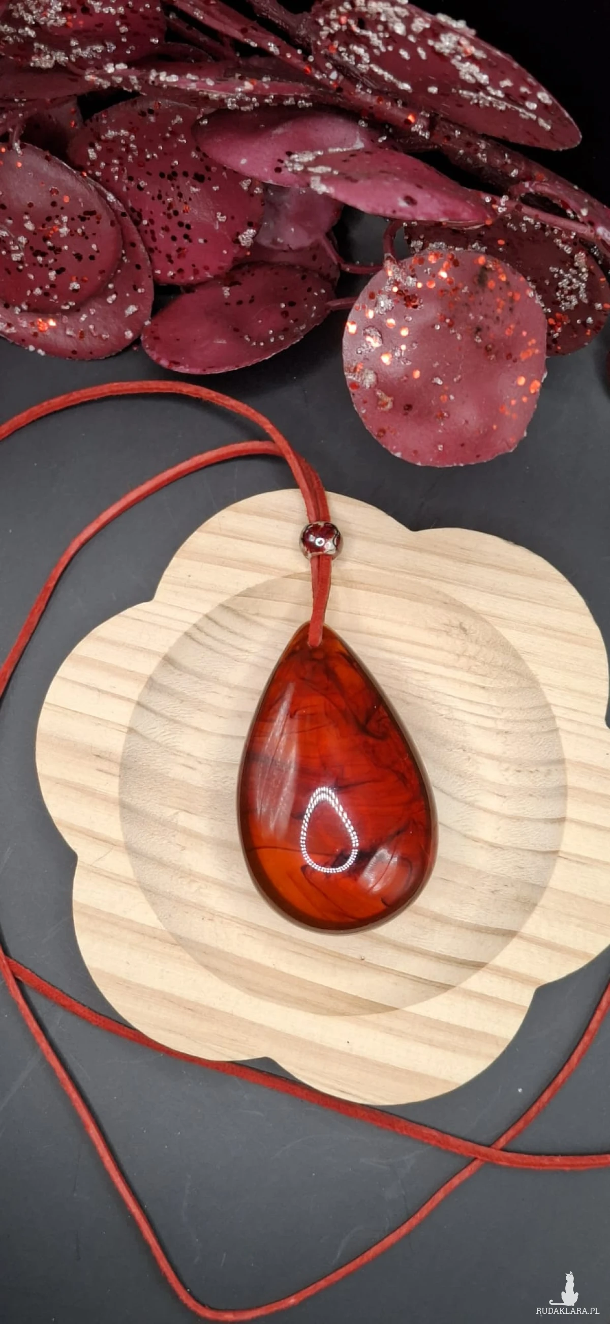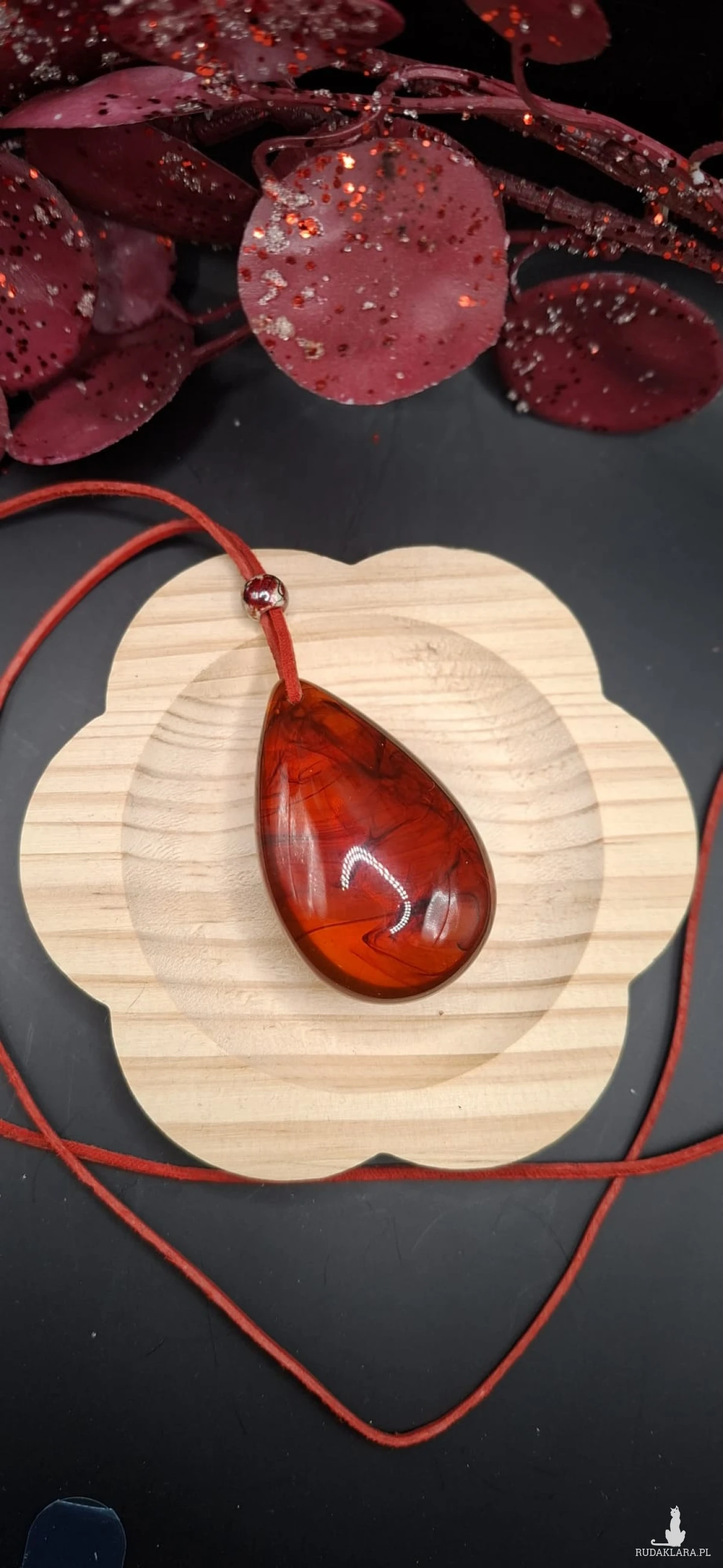 Przedmiotem sprzedaży jest ręcznie wykonany wisiorek z żywicy epoksydowej w pięknym, głębokim czerwonym kolorze. Każdy egzemplarz posiada niepowtarzalny wzór wewnątrz, dzięki czemu jest jedyny w swoim rodzaju.