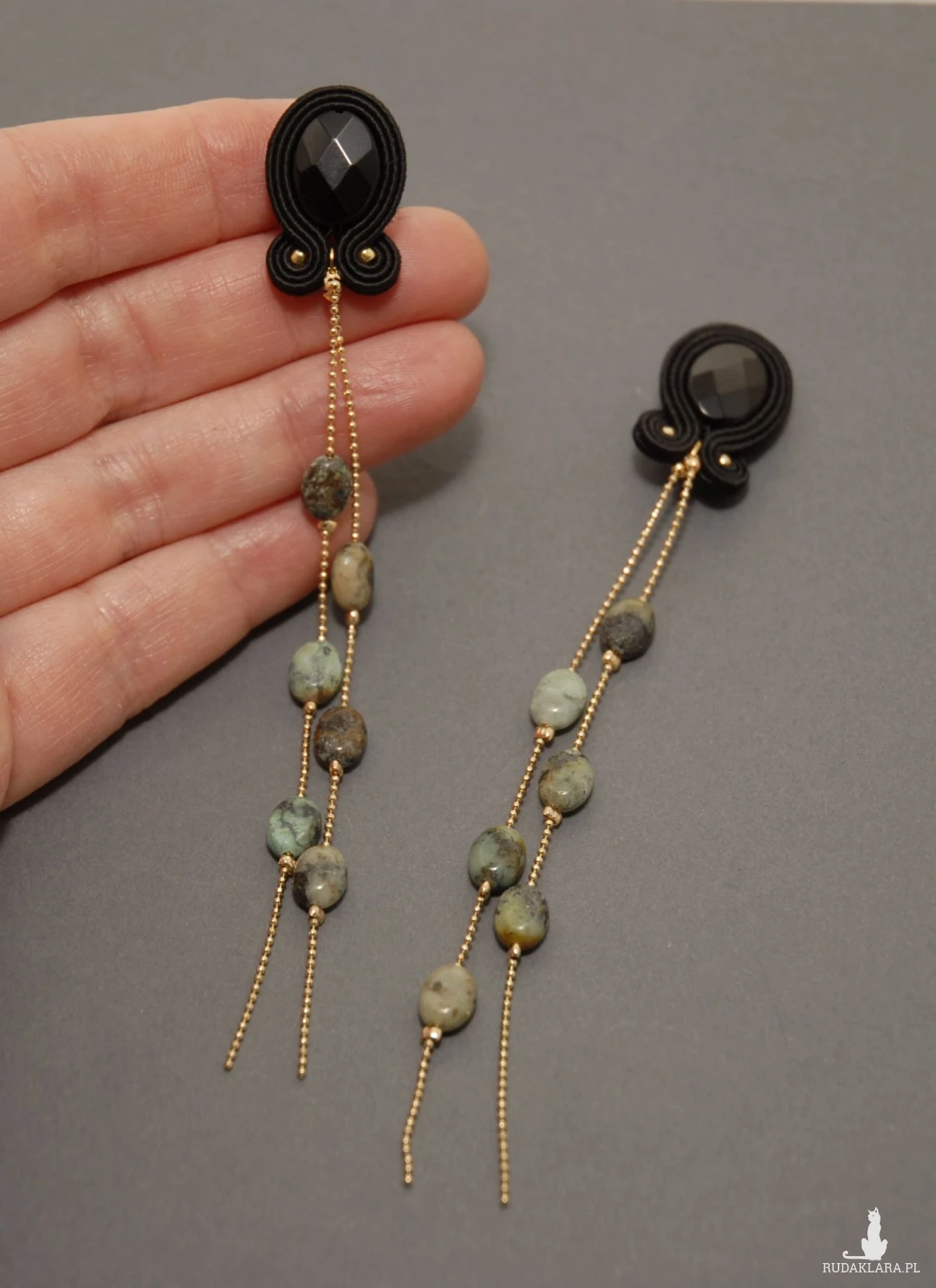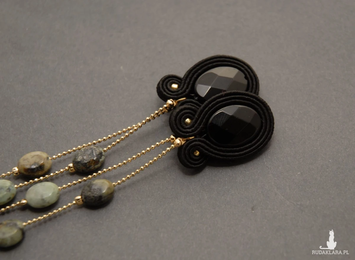 Kolczyki zrobione techniką sutasz, ozdobione dużymi, fasetowanymi onyksami i drobnymi turkusami. Drobne kamyki zamontowane są na pozłacanym łańcuszku.