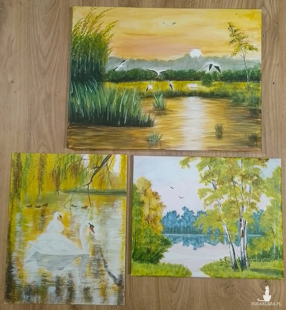 - Tematyka: Malownicze mokradła o zachodzie słońca, brzozowy gaj nad jeziorem, spójny motyw ptaków