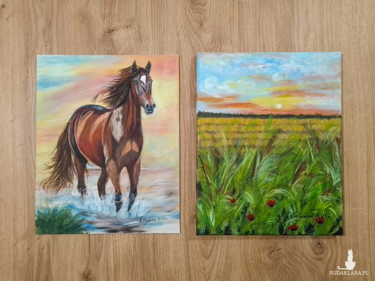 - Tematyka: Sielski widok makowej łąki, zachód słońca, galopujący koń