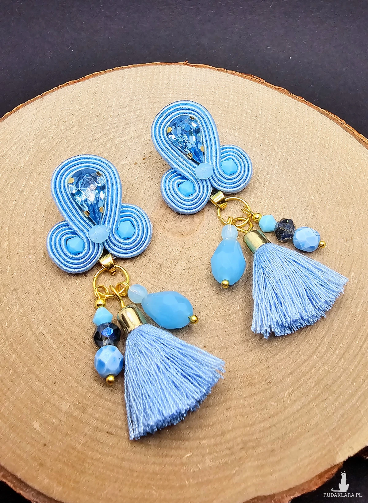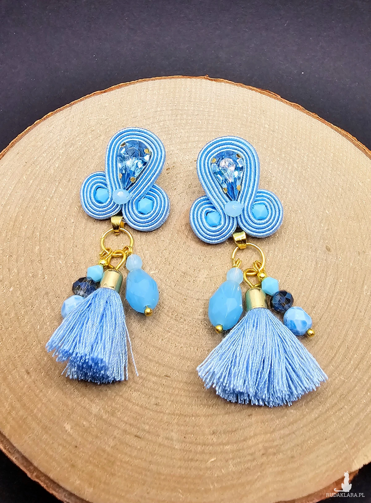 Fasetowane szklane kryształki w złotej oprawie otoczone sznurkami sutasz oraz szklanymi czeskimi koralikami. Dół kolczyków zdobią zawieszki z wiszących chwostów oraz szklane kryształki i koraliki. Kolczyki zamocowane na metalowych sztyftach w kolorze złotym.