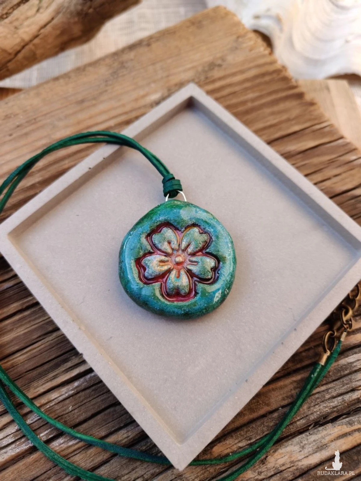 Unikatowa zawieszka wykonana ręcznie z glinki i malowana z dbałością o każdy detal. Delikatny motyw kwiatu w odcieniach zieleni nadaje jej naturalny, leśny charakter. Każdy egzemplarz jest jedyny w swoim rodzaju, dzięki czemu nosisz biżuterię, której nie ma nikt inny. Subtelny połysk pięknie podkreśla reliefowy wzór kwiatu, a zielony naturalny rzemyk idealnie komponuje się z kolorystyką zawieszki. To doskonały dodatek dla osób ceniących rękodzieło, naturę i oryginalny styl.
