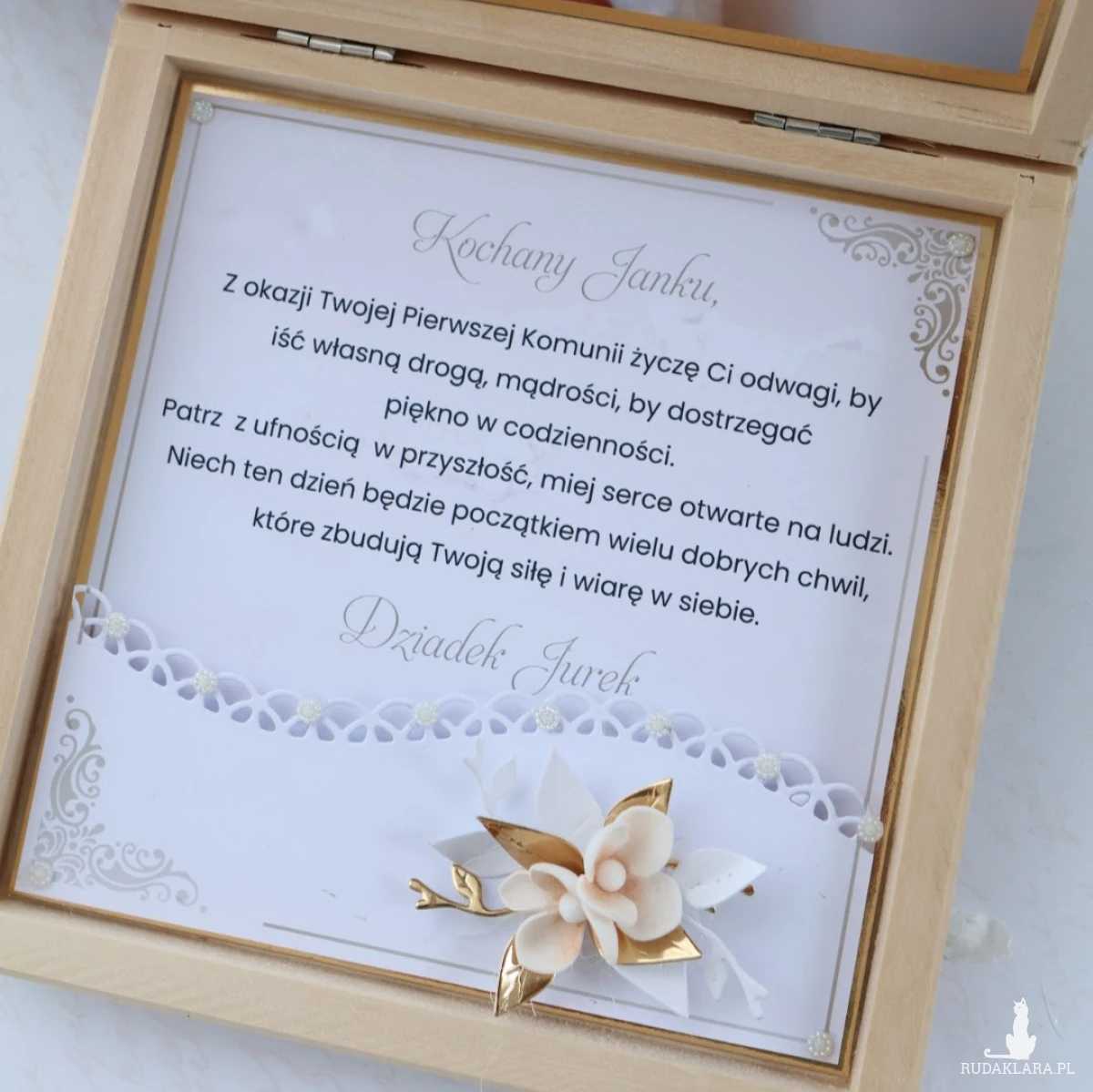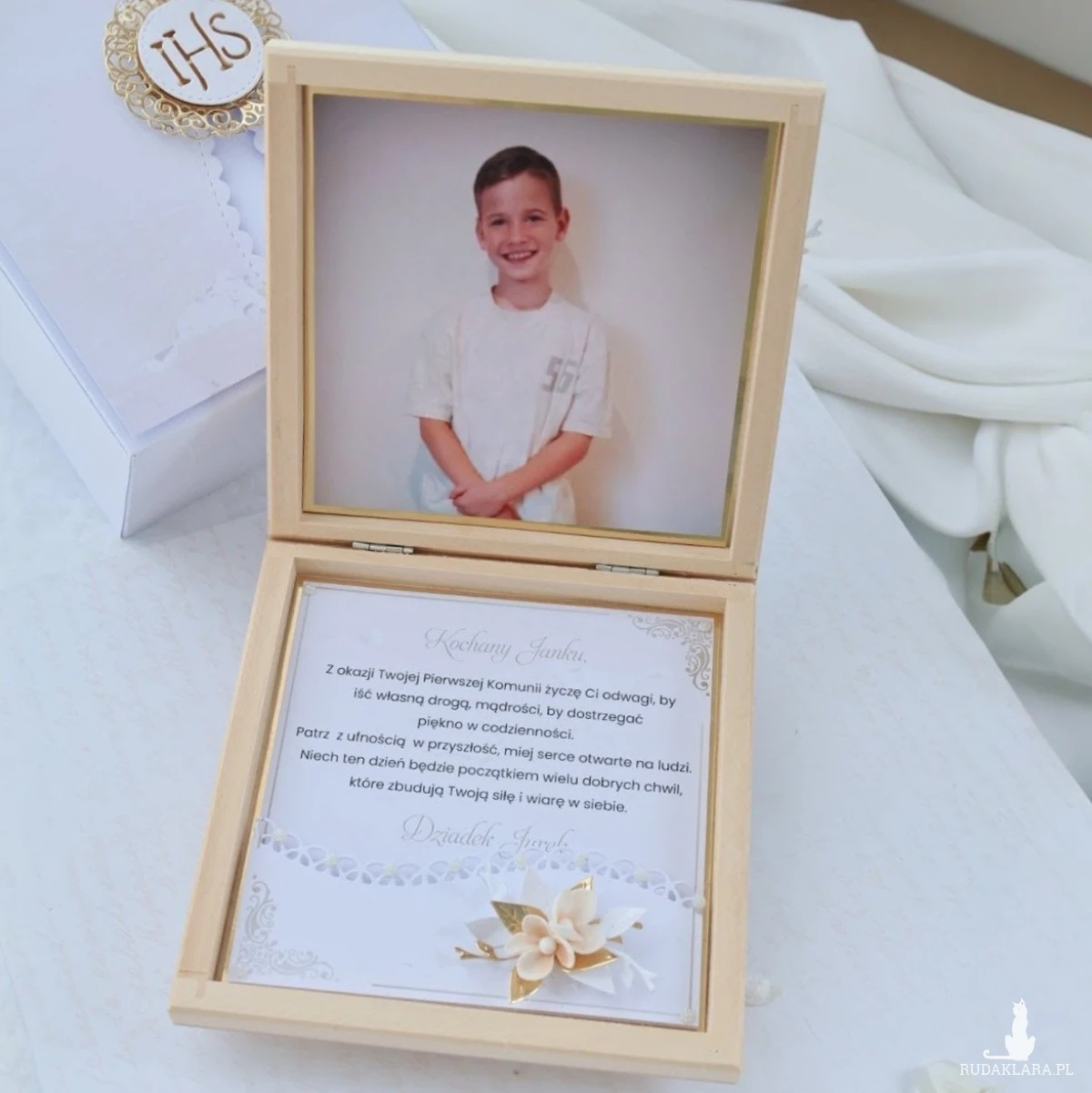 Personalizowana pamiątka Pierwszej Komunii Świętej w drewnianym pudełku to elegancki prezent, który zachwyci i będzie piękną pamiątką. W środku znajdują się życzenia - możesz wybrać tekst taki jak na zdjęciu lub dodać własny, kieszonka na pieniądze oraz kartka z kalendarza lub zdjęcie dziecka.